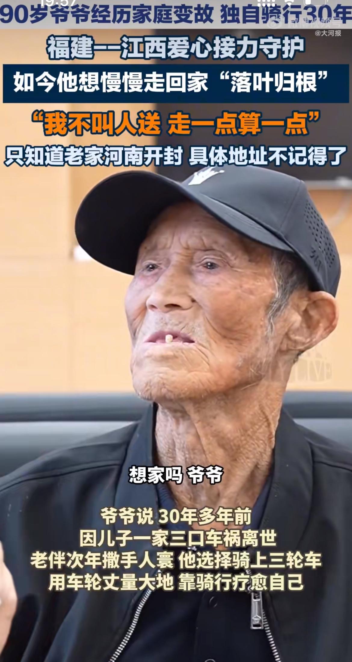 可怜人!90岁爷爷独自骑行30年,吃住全在破三轮上!到底是什么样的家破人亡,让他宁愿在公路上流浪半辈子,也不敢踏回老家一步?如今他白发苍苍想“落叶归根”,却连家在哪都忘了。面对大家的送行,他坚持“走一点算一点”! 江西上饶一位90岁白发苍苍的爷爷,骑着一辆改装过的三轮车,车上搭着简易的绿皮棚,棚顶贴着反光条,车头挂着写满经历的纸条,正用最朴素的方式完成一场跨越30年的“自我救赎”。 30多年前,一场车祸击碎了张中义老人的全部生活。他的儿子一家三口在事故中不幸离世,年幼的孙子也未能幸免。噩耗传来老伴整日以泪洗面,最终因悲伤过度哭瞎了双眼,第二年便撒手人寰。 接连失去四位至亲的打击,让当时年过六旬的张爷爷精神几近崩溃,他开始四处流浪,直到某天发现“骑着三轮车往前走”能让自己暂时忘记痛苦,这一骑就是30年。 这辆陪伴他半生的三轮车堪称“移动小家”。车斗里塞着被褥、锅碗和换洗衣物,棚顶用塑料布加固防雨,车头挂着装满工具的布袋。张爷爷的骑行路线没有规划,全凭心情:他沿着县道走过广州的早市、上海的外滩,甚至到过乌鲁木齐的戈壁滩。每到一处,他就在车头挂上新买的当地特色小物件,车棚上的反光条也越贴越多,这些都是沿途好心人送的“安全符”。 “回老家会想起伤心事,在外面看看风景就开心。”这是张爷爷常挂在嘴边的话。30年里,他拒绝过无数帮助:莆田的餐馆老板留他过年,杭州的退休教师想租房子给他养老,连偶遇的记者要给他买新棉鞋都被婉拒。他总说:“这不是行乞,是我的活法。”唯一接受的善意,是陌生人帮他加固车棚、更换轮胎,或是往他车筐里塞几个热包子。 2026年春天,90岁的张爷爷做出了新决定:他要“慢慢走回家”。这个“家”在河南开封,但具体地址他早已记不清,30年风餐露宿,记忆被岁月磨得模糊,只余下老家门前那棵老槐树的影子。 如今他的三轮车里多了样东西:志愿者帮他打印的“求助纸条”,上面写着“想回开封老家,请指路”。沿途遇到的卡车司机、环卫工人、小店老板,都成了他的“活地图”,有人用手机帮他查路线,有人直接骑车带他走几公里。 这场“归途”走得格外缓慢。张爷爷每天只骑十几公里,累了就支起车棚睡觉,饿了就用随身的小锅煮面条。有志愿者想开车送他,被他笑着拒绝:“我不叫人送,走一点算一点。”在他看来,骑行不是受罪,而是与世界的对话方式:“车轮转着,心里就踏实。” 心理专家指出,张爷爷的行为符合“创伤后成长”理论,通过持续性的行为转移注意力,逐步重建生活意义。更多网友则被老人的坚韧感动:有人整理出“爱心接力地图”,标注出老人可能经过的补给点;有人自发组建“护送群”,沿途提供简单修车工具和热水。正如志愿者小白所说:“他治愈了自己,也治愈了我们。” 目前开封当地民政部门已介入协助,通过户籍档案帮张爷爷寻找亲人旧居。而老人依然骑着他的三轮车,缓缓驶向记忆中的故乡。 如果你也被张爷爷的故事打动,点赞让更多人看到这份坚韧,转发给身边的朋友传递温暖,关注我,或许下一次,我们就能一起为老人指明回家的路。大众9X预售发布 可爱多一点,干爽多一点 来源:大河报