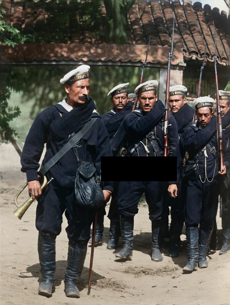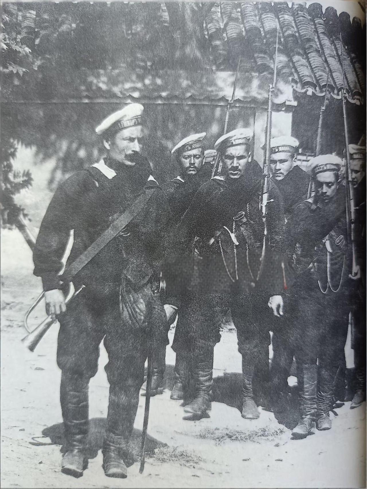 1900年,八国联军侵华时期,俄罗斯帝国(沙俄)海军水兵,最醒目的是沙俄海军白色无檐水兵帽,这是沙俄海军的标志性装备,帽墙通常印有所属舰名或部队番号,搭配黑色厚呢料水手服、长筒牛皮军靴、斜跨武装带,是19世纪末沙俄海军水兵的标准作战制服。 最左侧士兵手持铜制军号,是水兵的传令号手,用于作战时的冲锋、集合指令,其余士兵持带刺刀的莫辛-纳甘M1891式步枪,是清末侵华俄军的标准武器,刺刀出鞘、步枪上肩的姿态。
