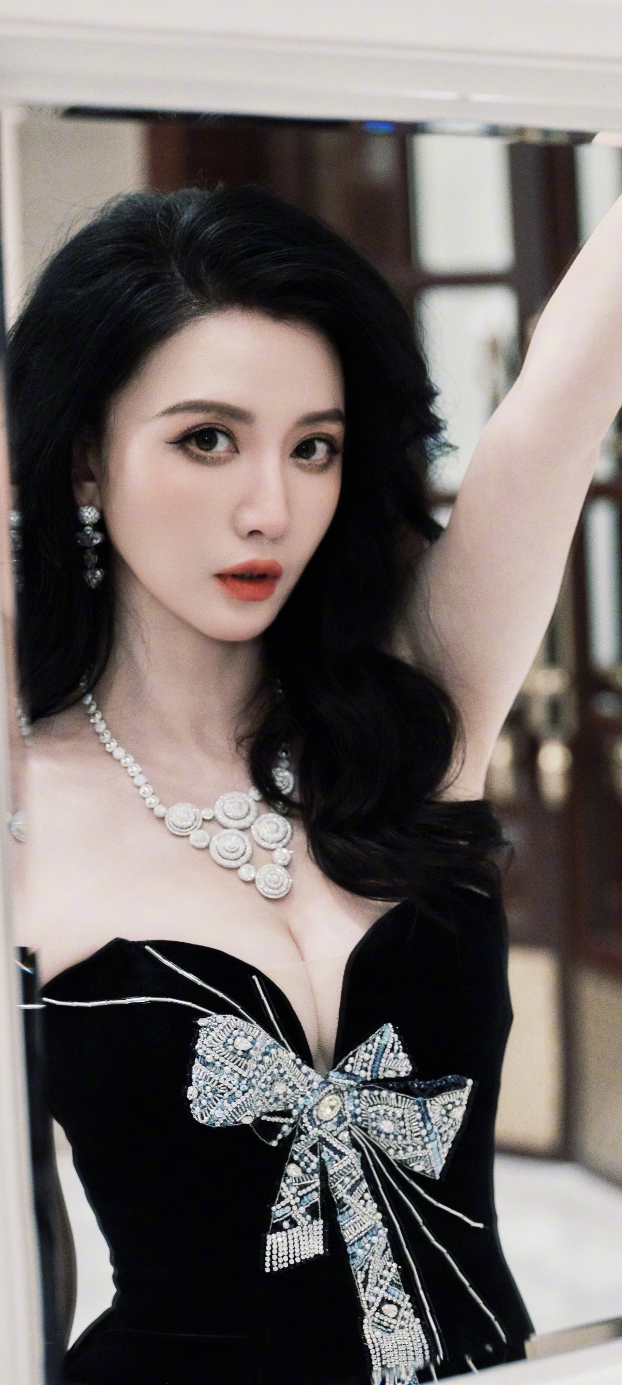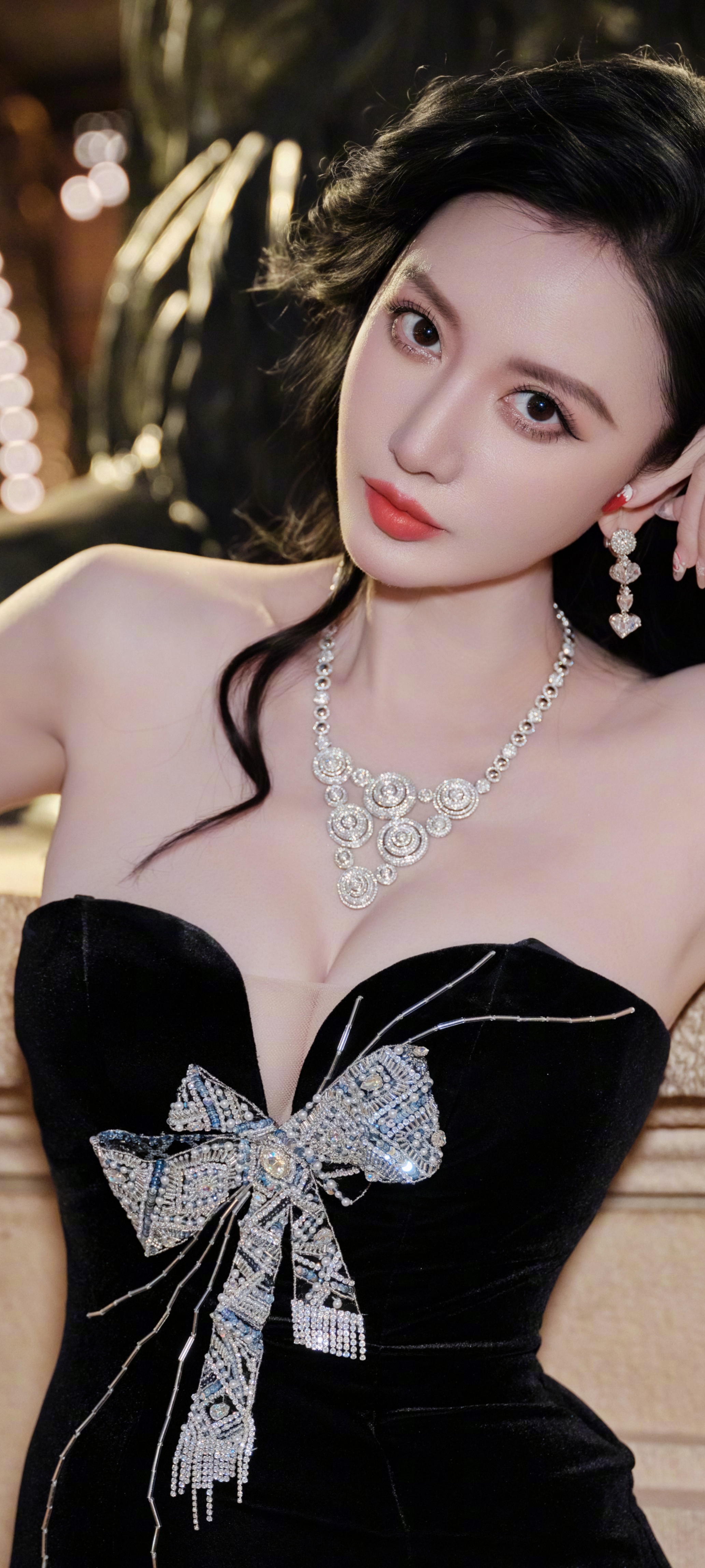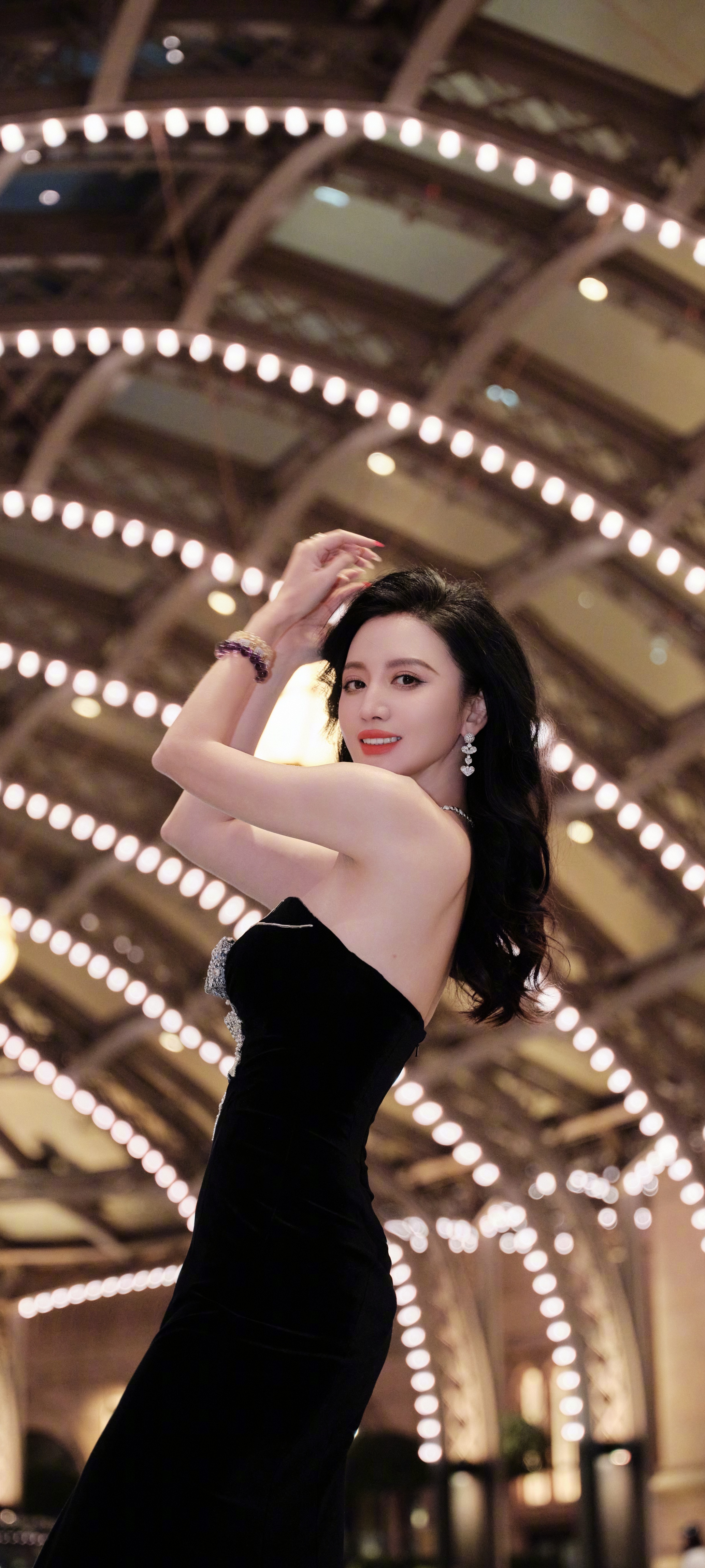 张萌穿搭壁纸,一身蝴蝶结抹胸黑裙,明艳的优雅气息。张萌