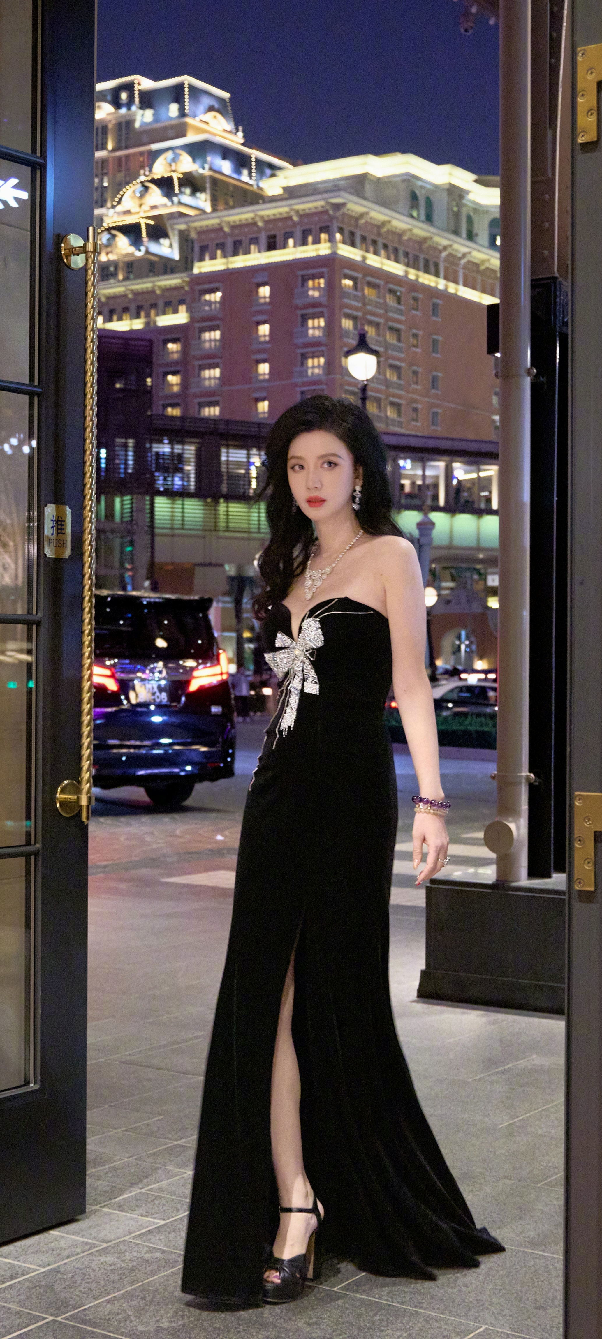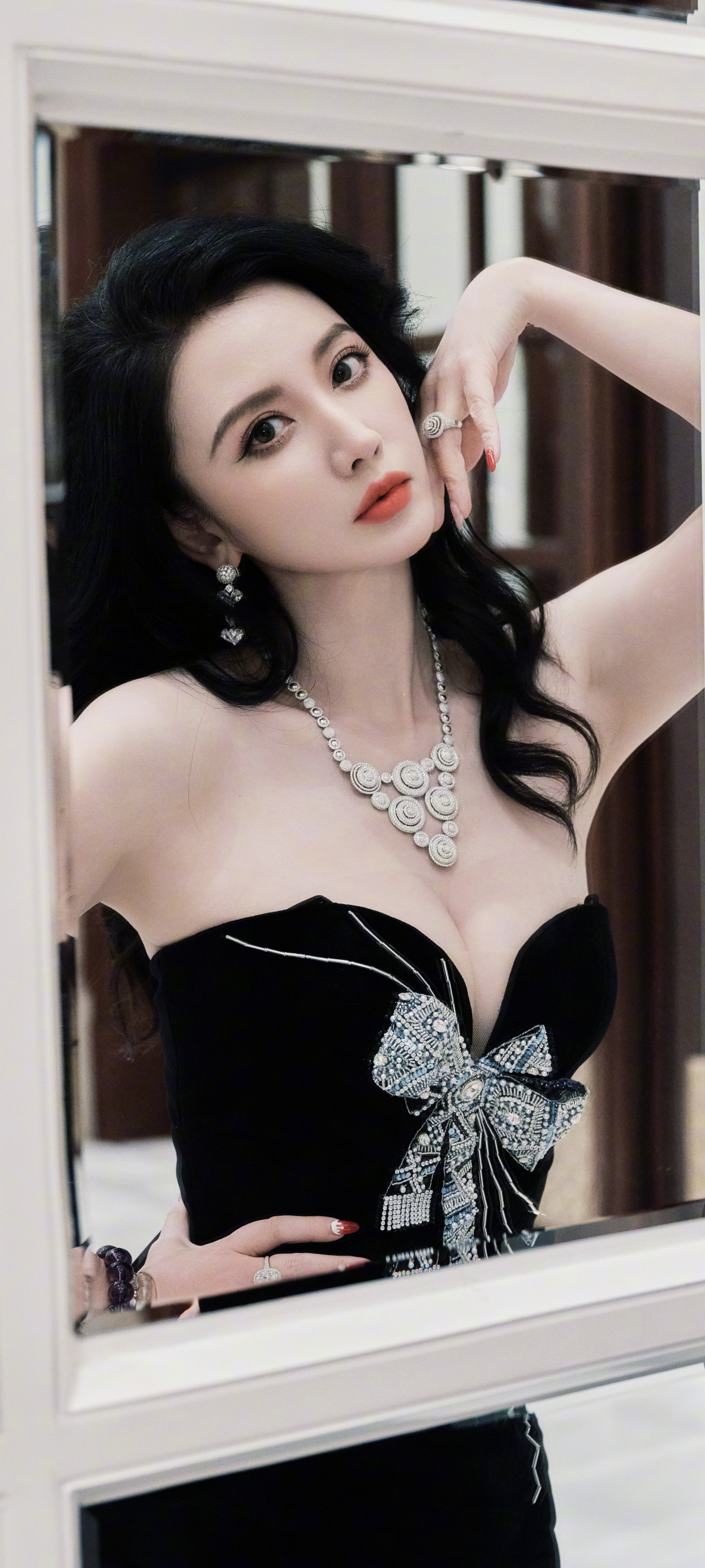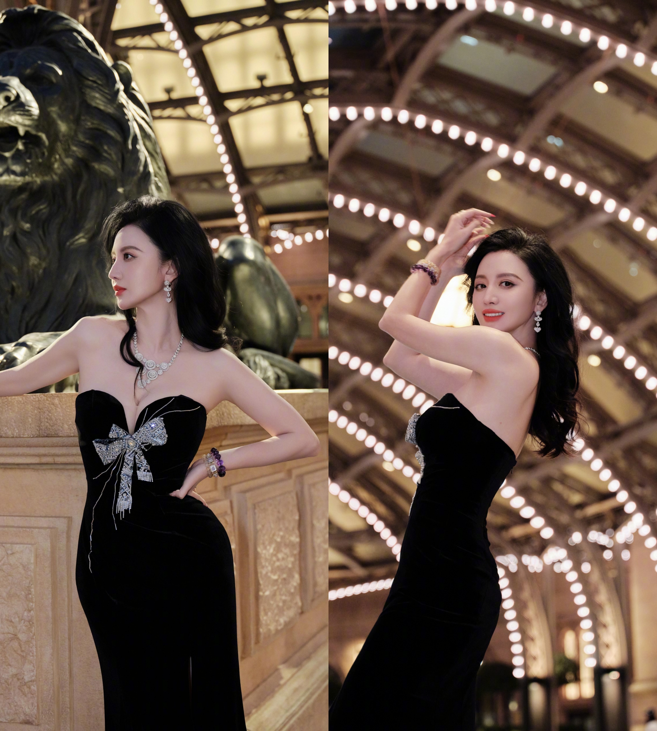 张萌穿搭壁纸,一身蝴蝶结抹胸黑裙,明艳的优雅气息。张萌