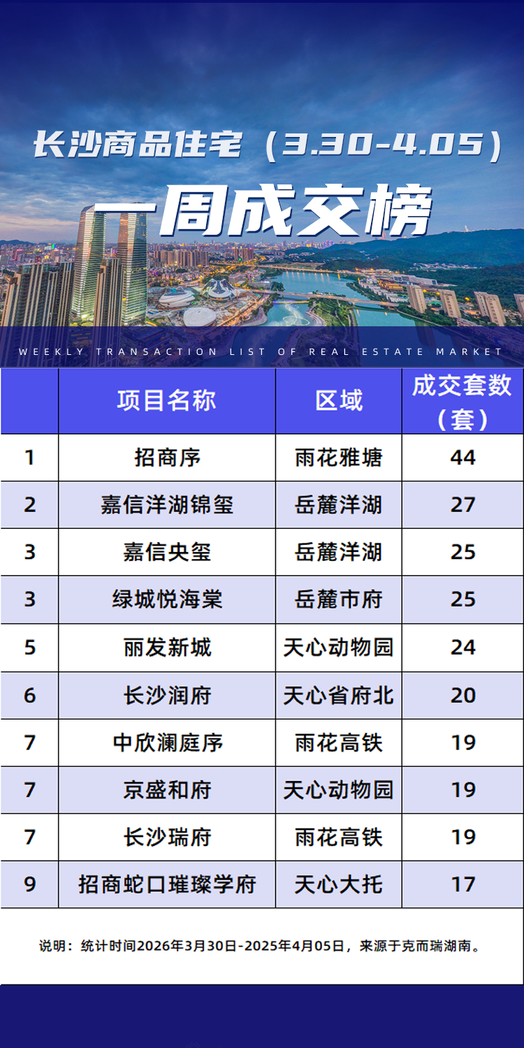 3.30-4.01,长沙内五区哪些楼盘网签成交套数更多?根据克而瑞发布的内五区(含高新区、长沙县托管区域)商品住宅成交榜单显示,招商序、嘉信洋湖锦玺、嘉信央玺、绿城悦海棠、丽发新城、长沙润府、中欣澜庭序、京盛和府、长沙瑞府、招商蛇口璀璨学府等10个楼盘上榜。榜首成交套数44套,第十名成交17套。