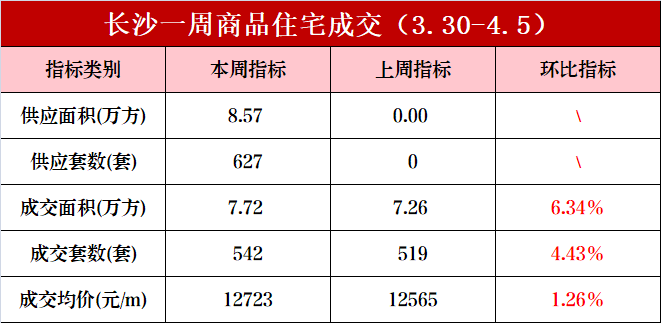 新房市场方面,上周(3.30-4.05)长沙内五区(含高新区、长沙县托管区域)一手住宅成交542套、7.72万方,成交均价12723元/㎡。供应上,长沙内五区(含高新区、长沙县托管区域)一手住宅新增供应627套,8.57万方。