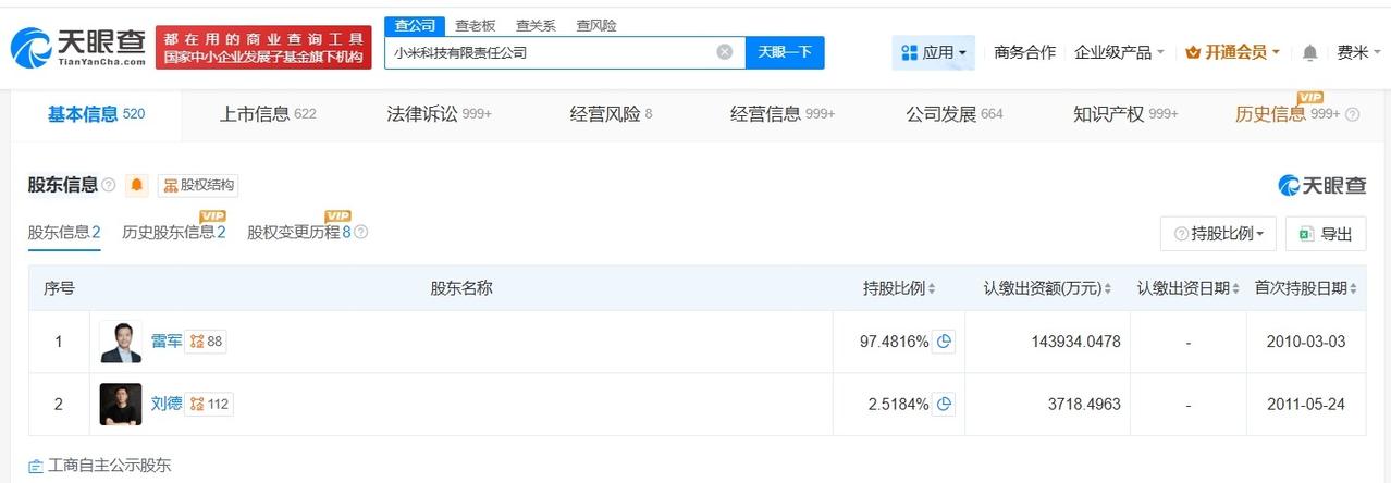 黎万强、洪锋退股小米科技 小米科技减资至约14.8亿 天眼查App显示,近日,小米科技有限责任公司发生工商变更,原股东小米联合创始人黎万强、洪锋退出,同时,注册资本由18.5亿人民币减至约14.8亿人民币。 该公司成立于2010年3月,法定代表人为雷军,经营范围包括通讯设备销售、厨具卫具及日用杂品批发、厨具卫具及日用杂品零售等,现由雷军、刘德共同持股。 天眼查信息:
