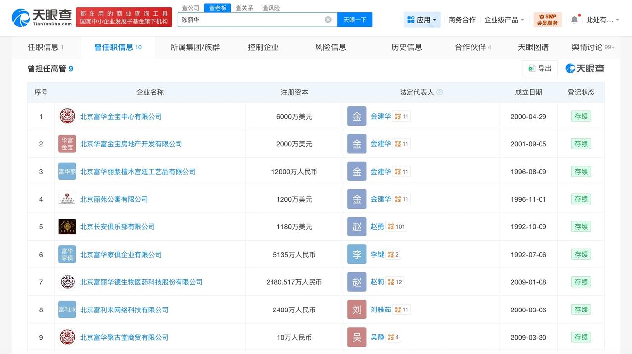 陈丽华名下公司叫丽质华堂 陈丽华名下关联1家公司陈丽华逝世 据媒体报道,富华国际集团4月7日发布讣告:陈丽华女士因病医治无效,于2026年4月5日在北京逝世,享年85岁。 天眼查App显示,陈丽华名下关联1家公司,为北京丽质华堂化妆品有限公司,该公司成立于2019年7月,法定代表人为赵莉,注册资本200万人民币,经营范围含批发、零售化妆品、文具用品、电子产品等,由香港丽质华堂生物医药科技有限公司全资持股,陈丽华在该公司担任董事。值得一提的是,陈丽华此前曾在多家公司担任高管,包括北京富华金宝中心有限公司、北京长安俱乐部有限公司、北京丽苑公寓有限公司等。 天眼查信息:-c3350537693
