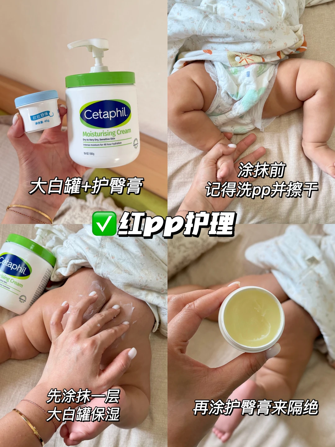 红屁屁:先涂大白罐保湿,再涂护臀膏隔绝