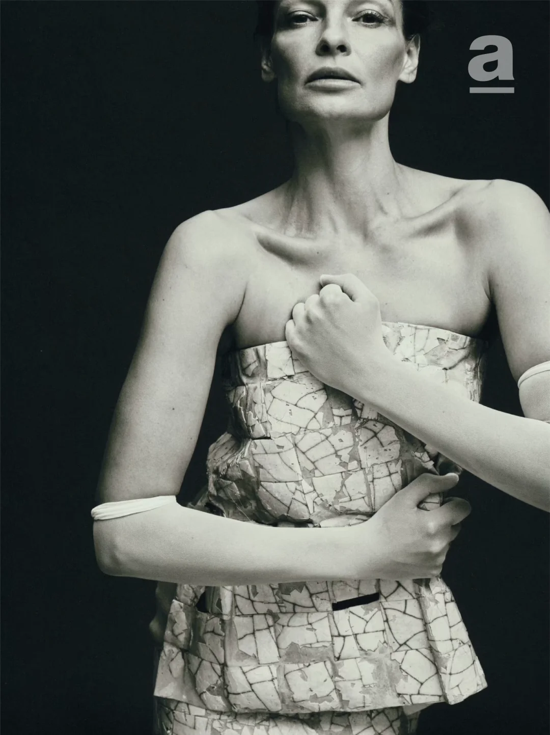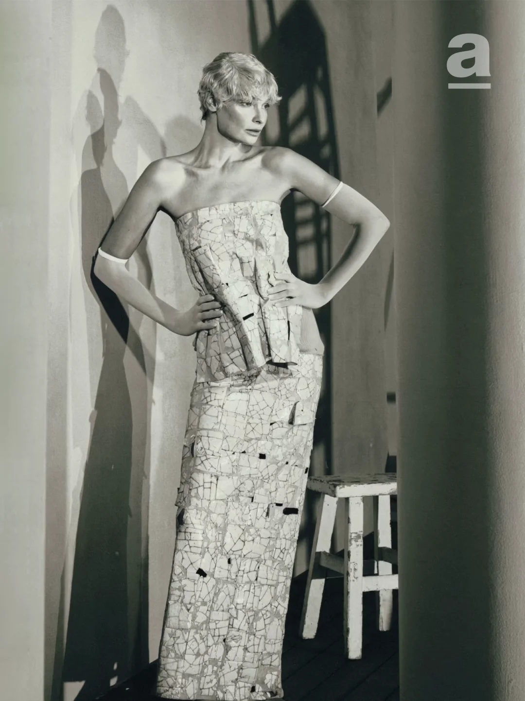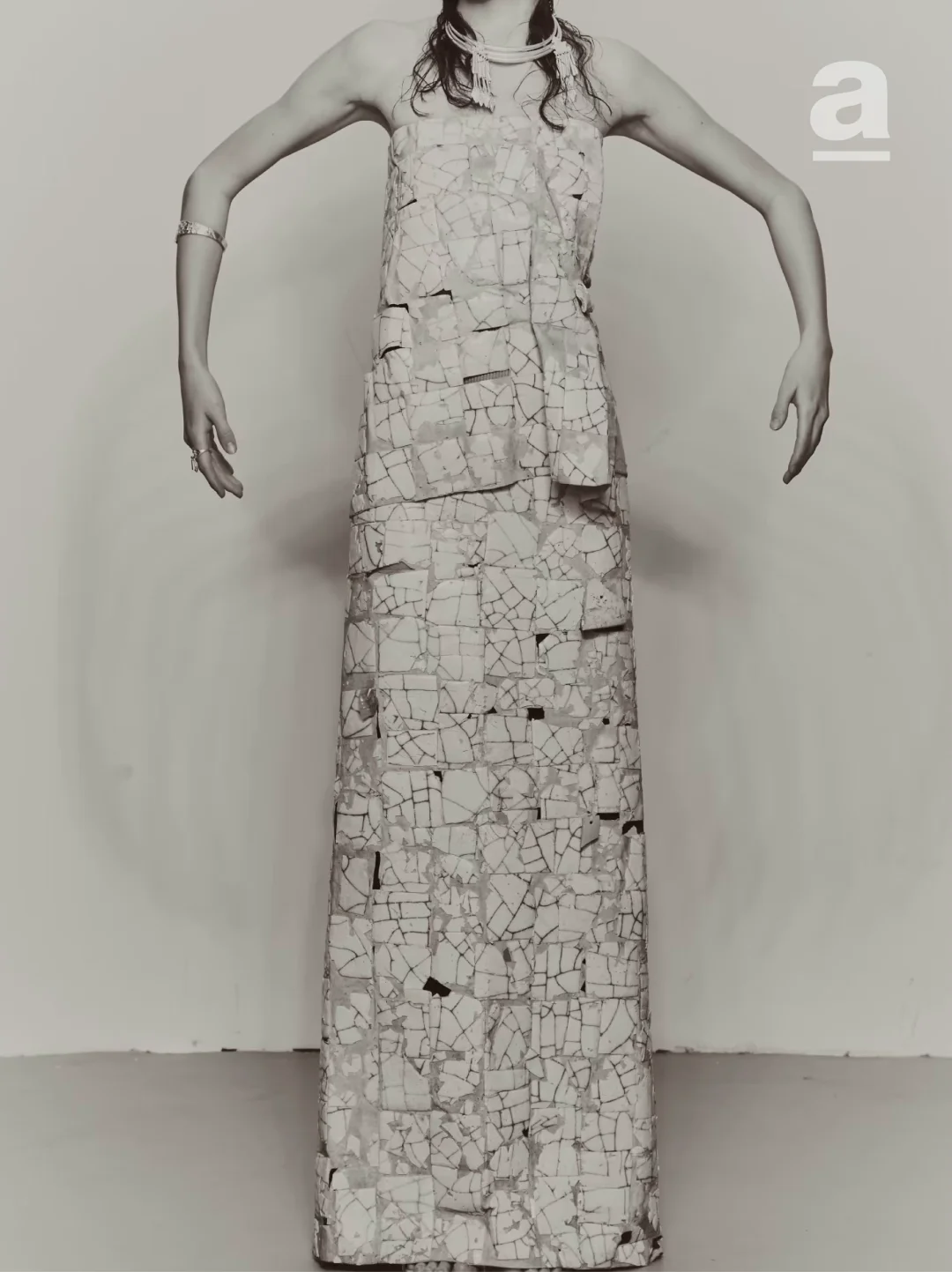 核心工艺上,两者更是展现了截然不同的创作。马吉拉的工艺核心是“毁灭与重生”:工匠按照人体版型烧制出完整的瓷板,再亲手将其击碎成不规则的碎片,逐片打磨掉锋利的边缘后,一点点粘缝在基底上。Glenn Martens表示,灵感来自19世纪的欧洲瓷娃娃和品牌90年代的破碎陶瓷档案,想用解构的方式赋予陶瓷全新的生命力。