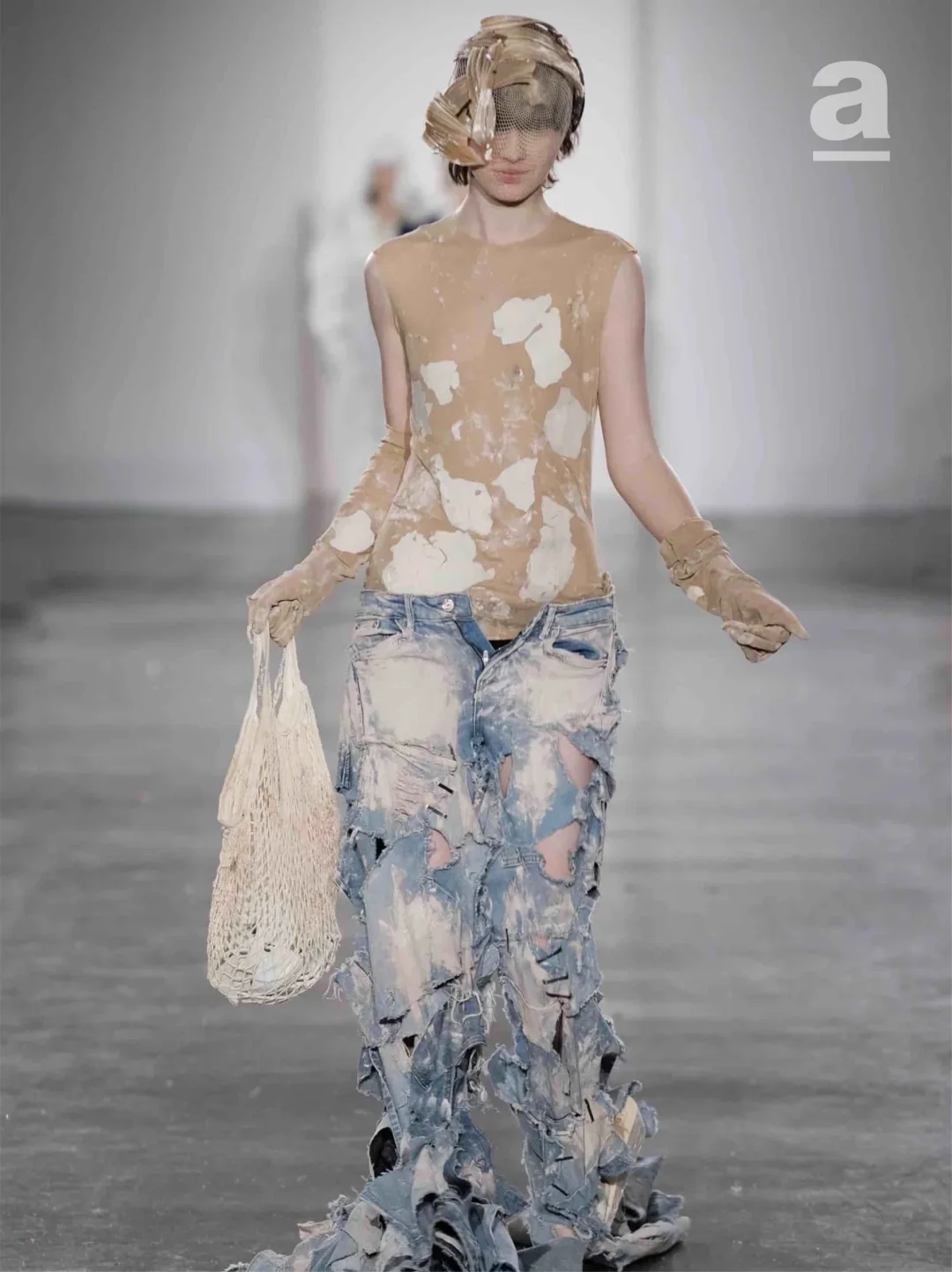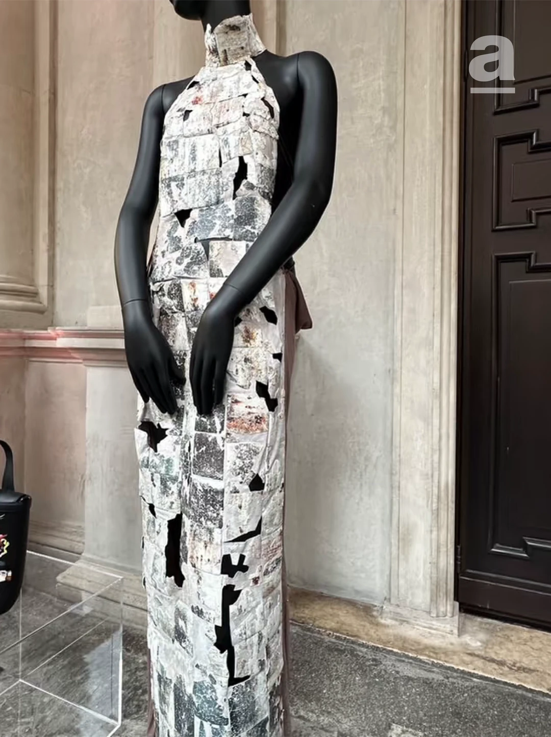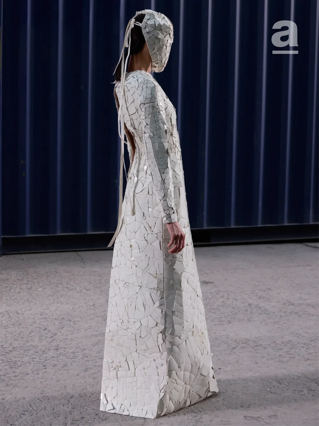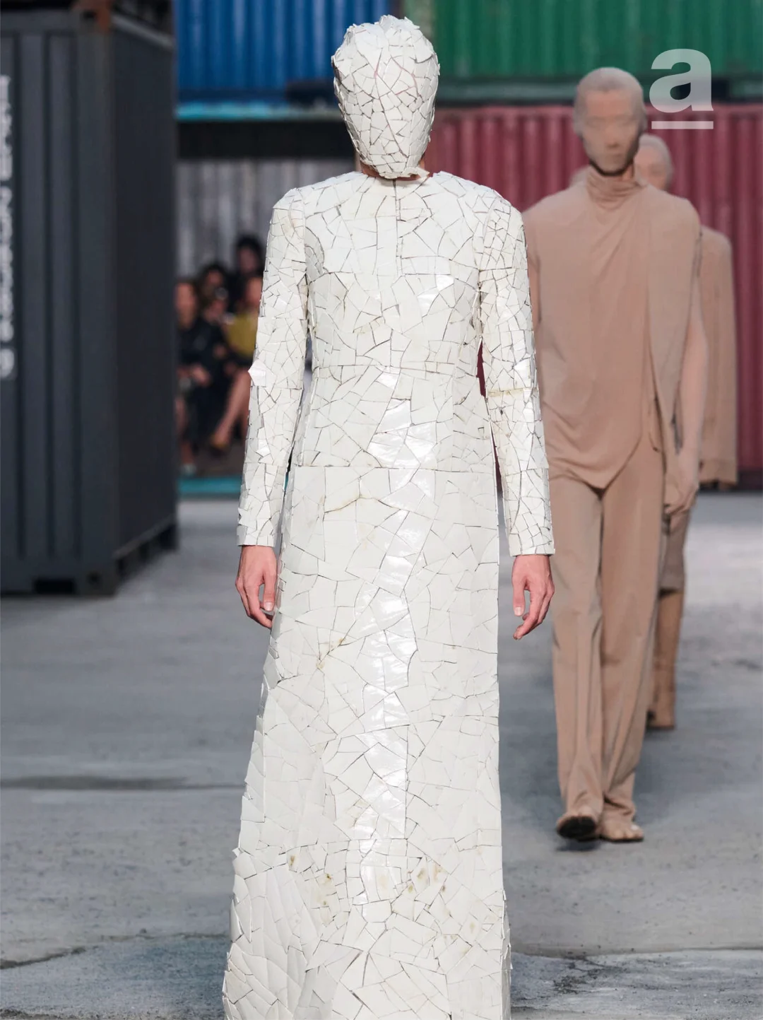 Maison Margiela的碎瓷裙由500多片手工烧制的瓷片组成,牢牢固定在欧根纱基底上,净重高达90斤,几乎等同于一个成年女性的体重。坚硬的瓷片让模特只能缓慢踱步,每走一步,裙摆上的瓷片都会继续碎裂,发出清脆的声响。这种“边走边碎”的沉浸式体验,成为全场最震撼的记忆点,但也有不少网友提出疑问:这样的设计是否真的考虑了穿着者的感受?