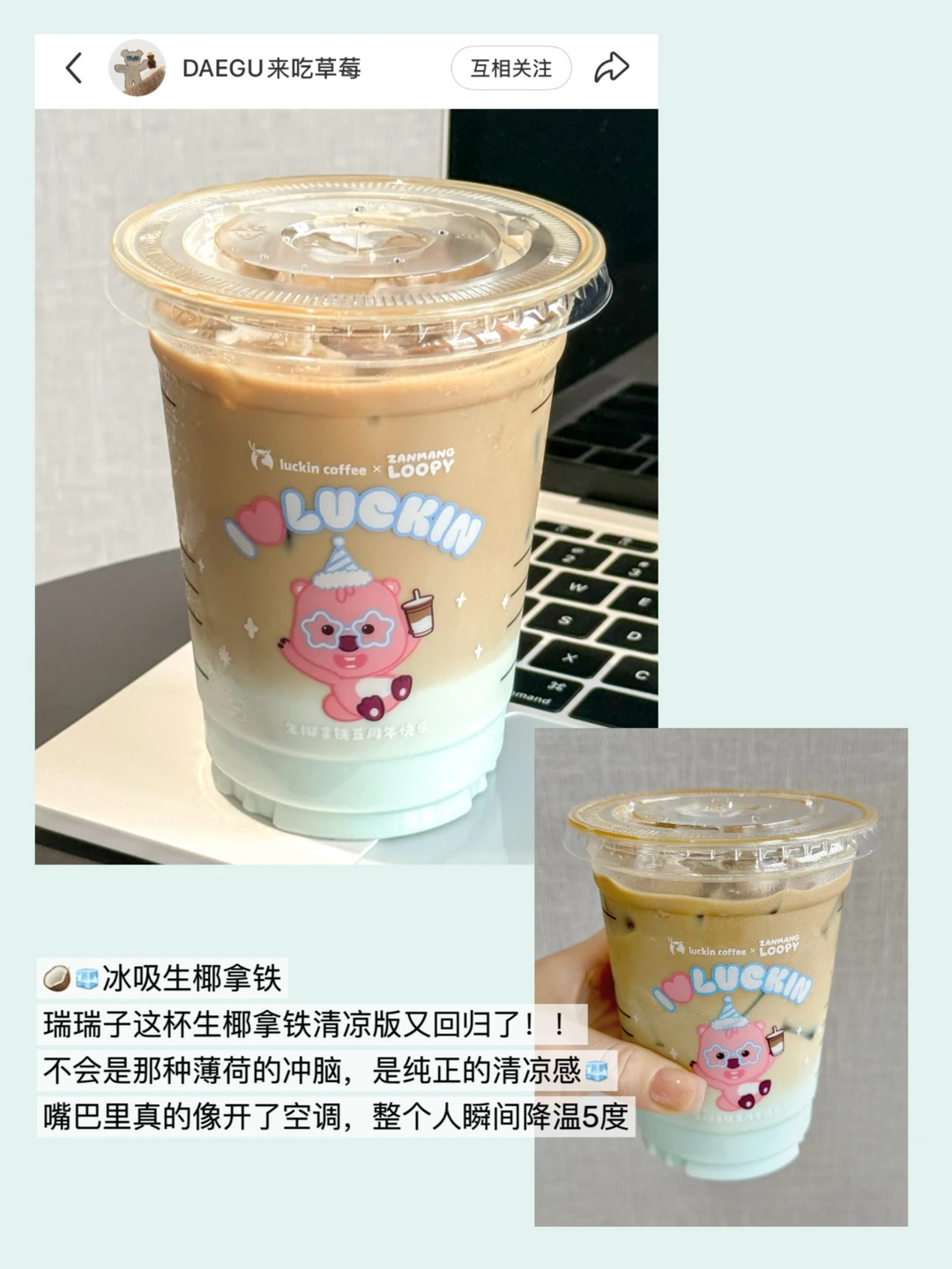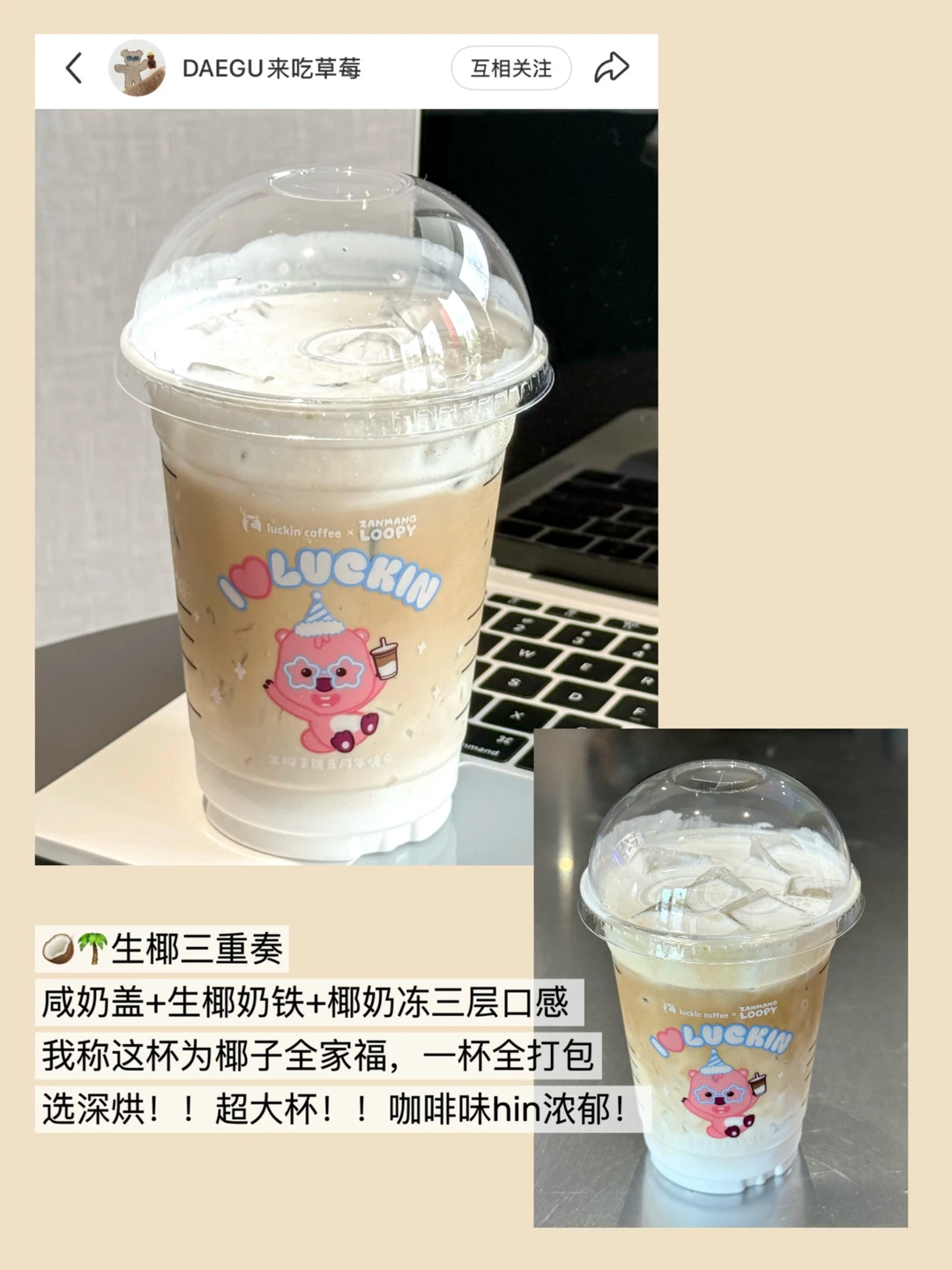 我的年度挚爱——冰吸生椰拿铁回归了!! 这种大事情我一定要大说特说!!! 我跟你们说,这杯真的是“嘴巴里开空调” 🧊 猛吸一口,那个凉意不是薄荷那种冲的 是从喉咙一直凉到胃,感觉整个人被扔进了冷柜❄️ 而且它的椰香巨浓巨纯! 椰香➕咖啡香,顺滑浓郁香晕了 还有这杯生椰三重奏 咸奶盖+生椰奶铁+椰奶冻三层口感 我愿称之为椰子全家福,生椰脑袋的本命 记得选深烘浓缩➕不另外加糖 这样咖味更重,hin满足 这次联名还是陶喆➕loopy 笑鼠了,陶吉吉变成萌萌loopy 贴纸和冰箱贴我要珍藏!!