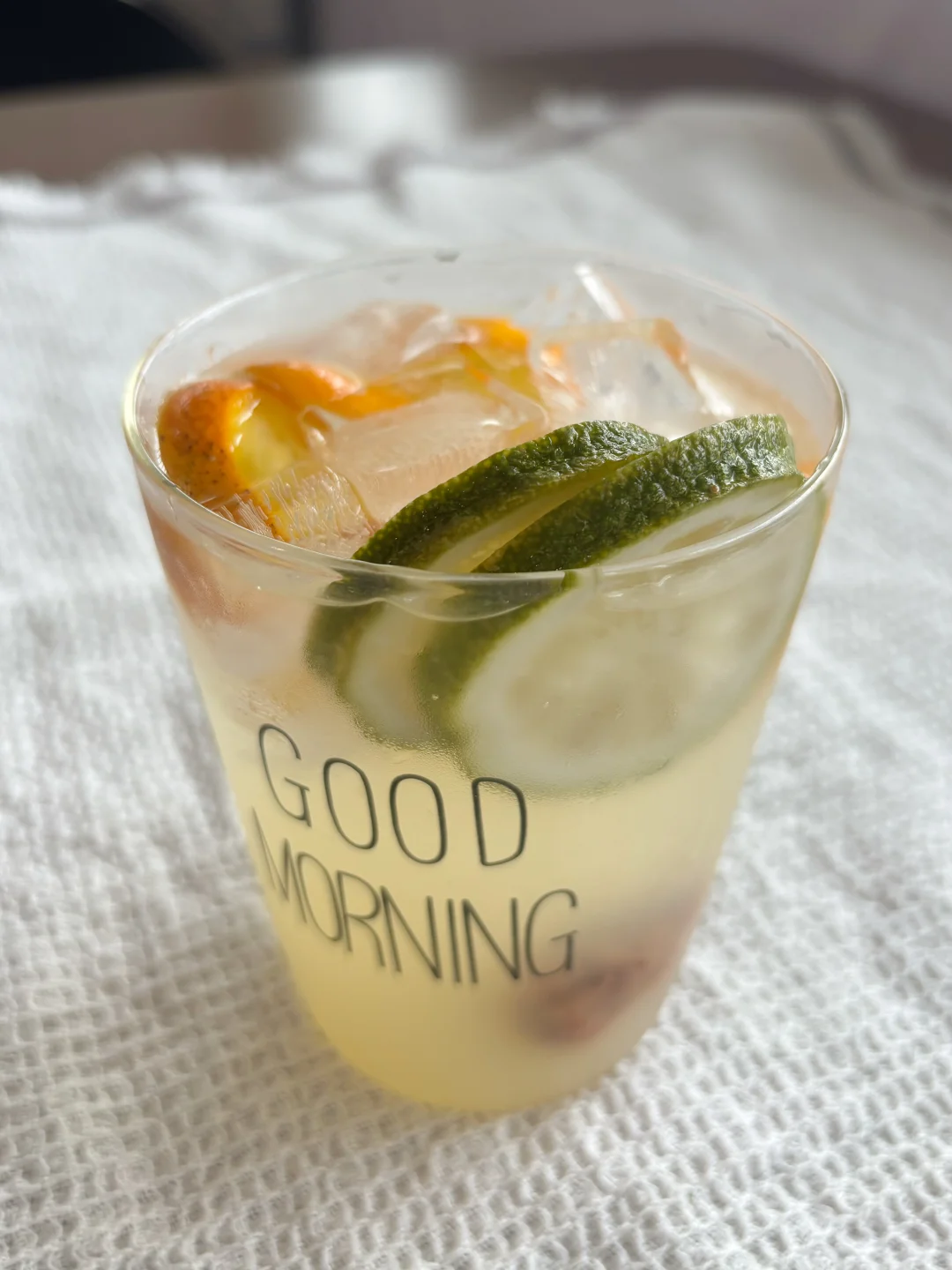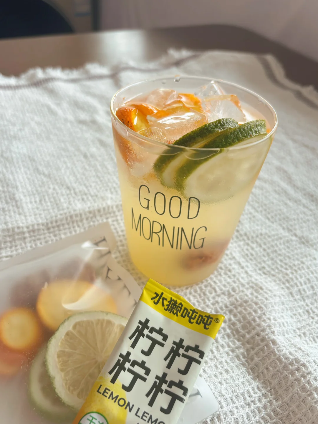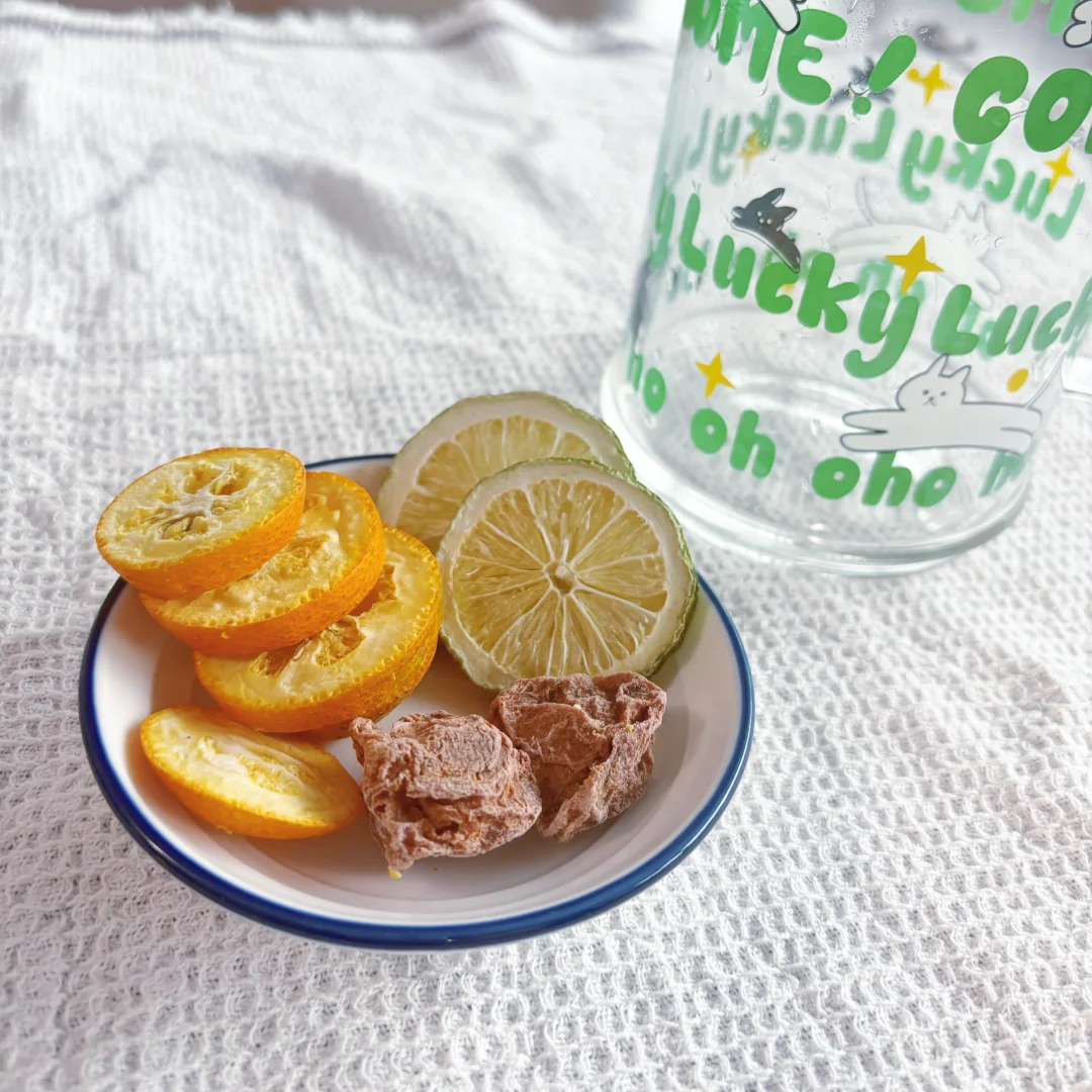 金桔和柠檬真是黄金组合啊,还没有糖,喝起来完全没有负担。不喜欢白开水就喝这个,话梅味酸酸甜甜,解腻又解渴。 柠檬液无糖,冻干花果茶里面也没有冰糖,真是深得我心[点赞R]