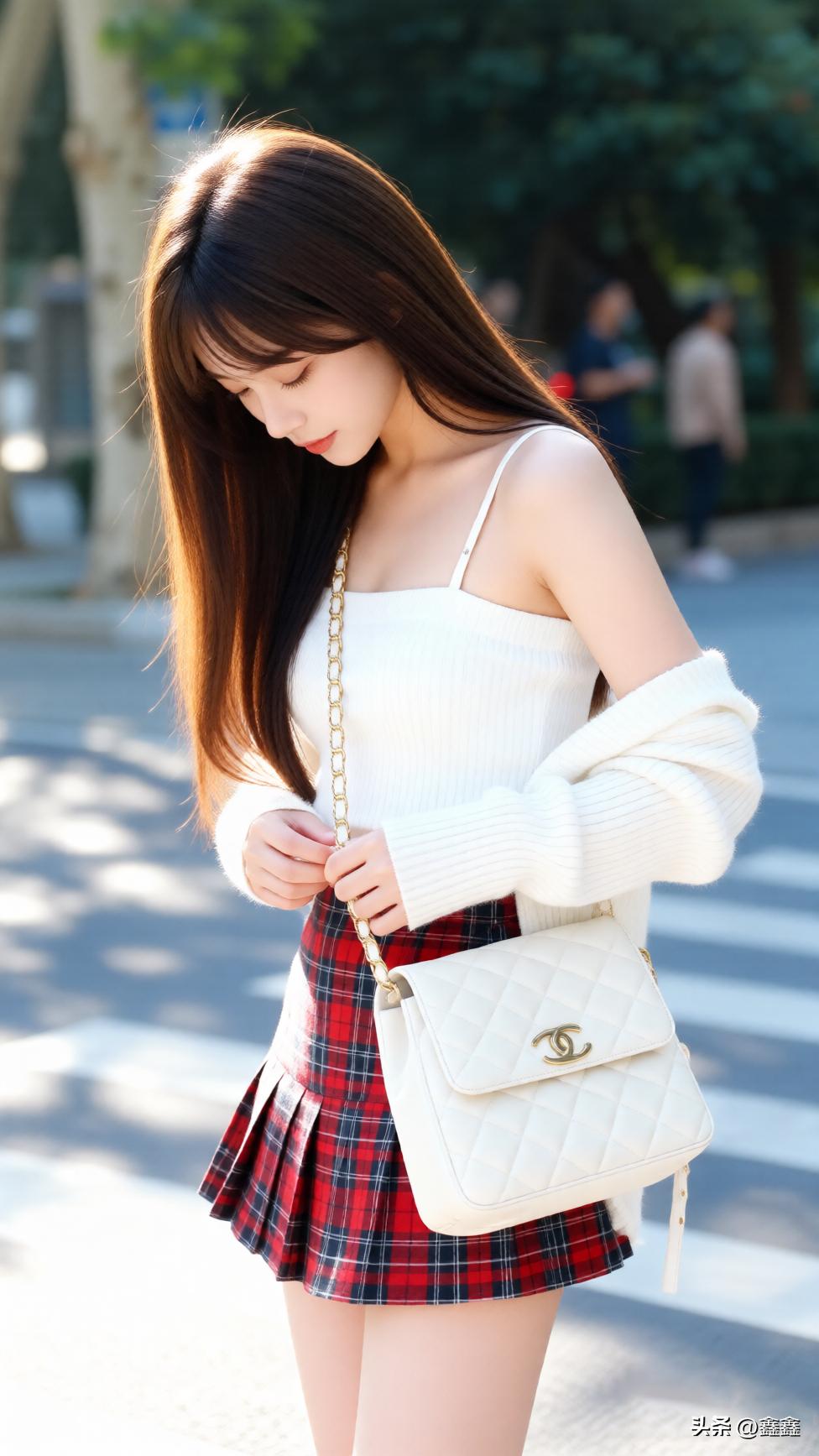 秋日暖阳下,白裙红裙的少女,静坐长椅,温柔如水。