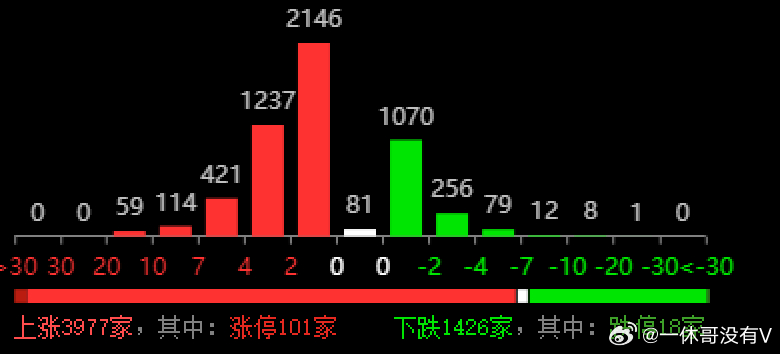 个股普涨回来了,红近4000家,绿1400多家,关键是涨停101家,人气情绪回来了希望后面能保持住