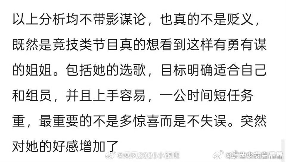 叶一茜本季谋略TOP姐叶一茜聪明叶一茜组队真的太清醒太会了!目标明确、思路清晰,选队友精准互补,每一步都踩在点子上,理性又有格局,妥妥本季谋略天花板,又聪明又稳,太圈粉了!叶一茜清醒理性的组队策略