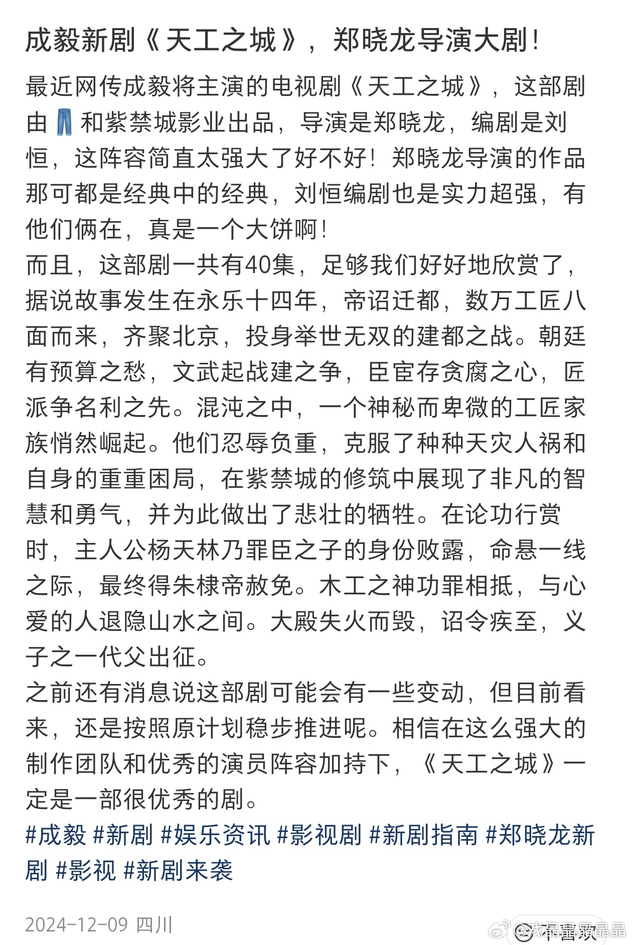 Cy从23年就发通稿要演天工之城这个大饼,现在传出来花落黄轩,黄轩是85年出生的