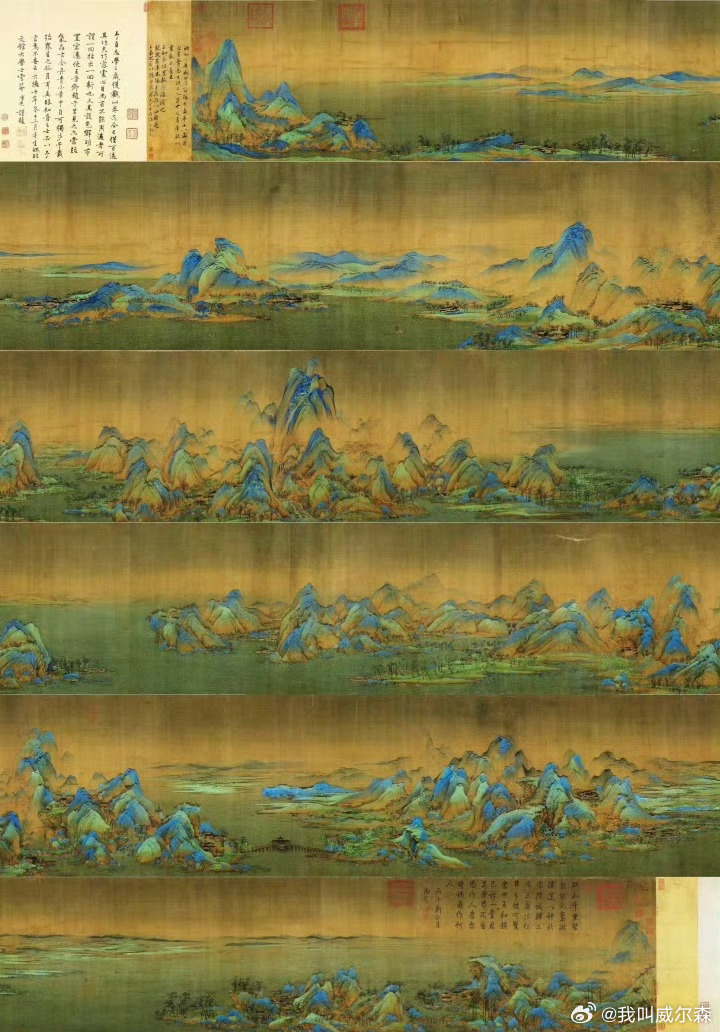 一卷青绿,千年江山,这一副传世佳作以石青、石绿矿物颜料绘就11.9米长卷,峰峦叠翠、江河浩渺,人物舟桥藏于其间,是中国青绿山水巅峰之作,现藏故宫博物院,当然,这一幅画也不是一般人能够看见的,在建国以来,只展出过三次:2009,2013,2017