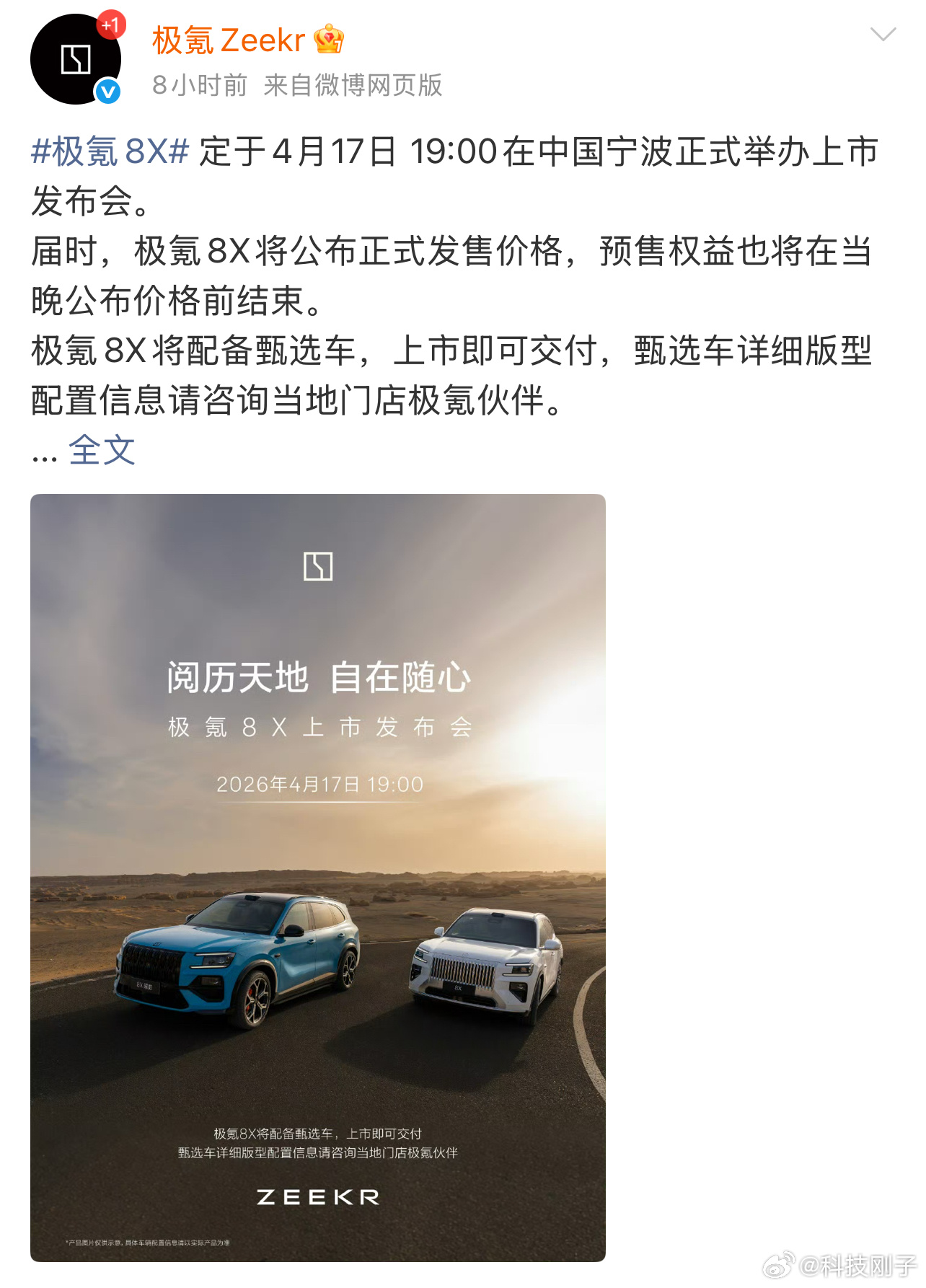 极氪8X官宣4月17日正式上市 极氪8X定了,17号浙江宁波发布,作为极氪9X的兄弟车型,8X从预售就赚足了眼球,38分钟破万的订单量,已经把市场期待拉满了。