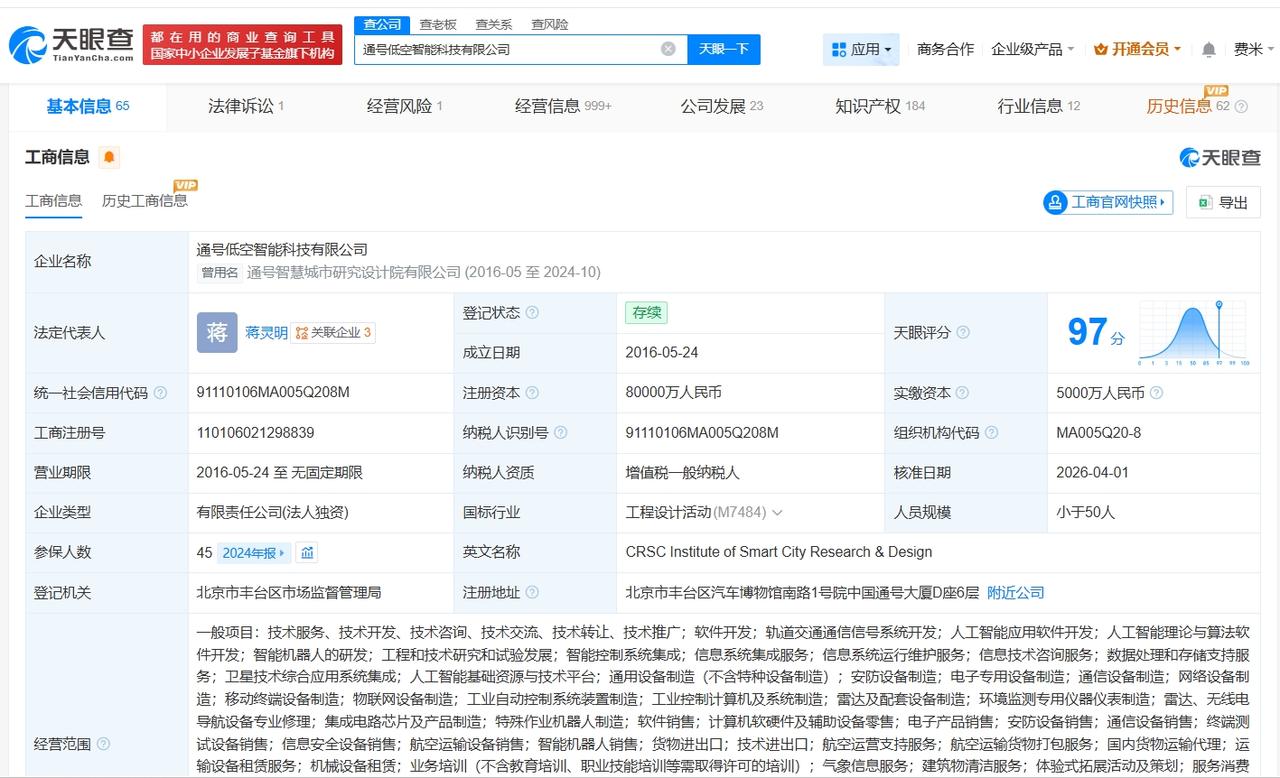 中国通号旗下低空智能科技公司增资至8亿 增幅约167% 天眼查App显示,近日,通号低空智能科技有限公司发生工商变更,注册资本由3亿人民币增至8亿人民币,增幅约167%。 该公司成立于2016年5月,法定代表人为蒋灵明,经营范围包括轨道交通通信信号系统开发、人工智能应用软件开发、通用航空服务等,由中国通号(688009)全资持股。 天眼查信息: