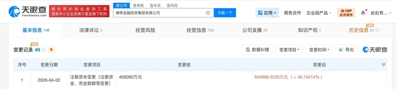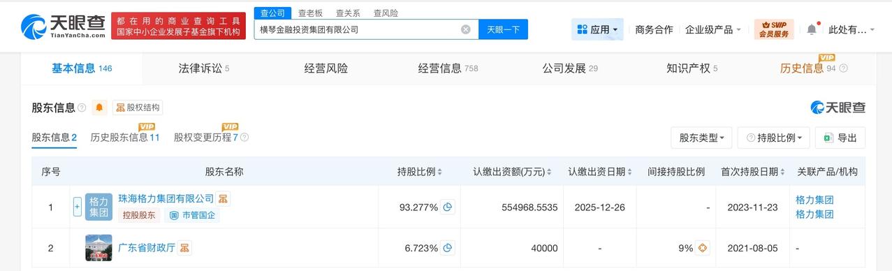 横琴金融投资集团增资至59.5亿 增幅约49% 天眼查工商信息显示,近日,横琴金融投资集团有限公司发生工商变更,注册资本由40亿人民币增至约59.5亿人民币,增幅约49%。 该公司成立于2014年1月,法定代表人为易晓明,经营范围包括以自有资金从事投资活动、自有资金投资的资产管理服务、社会经济咨询服务等。股东信息显示,该公司由珠海格力集团有限公司、广东省财政厅共同持股。 天眼查信息: