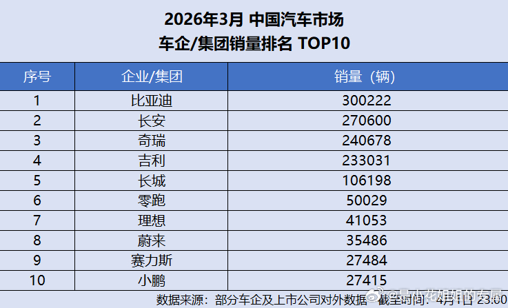 比亚迪发布2026年3月产销数据,单月总销量达300222辆,突破30万辆大关,3月单月中国车企销冠,虽然对于比亚迪破30万辆这件事情我们没有太多的触动了,毕竟比亚迪每月的销量都是一骑绝尘。
