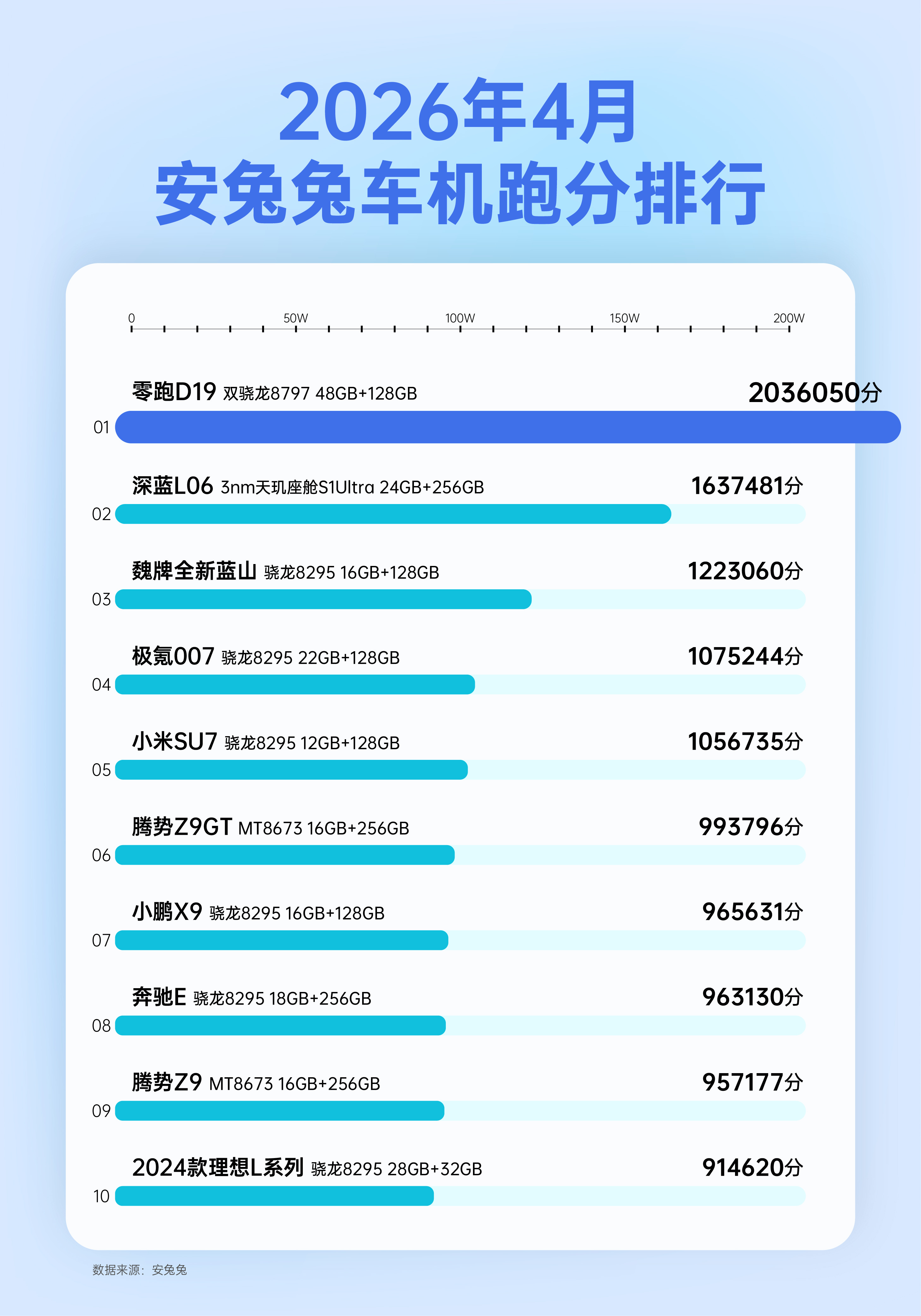 零跑D19安兔兔跑分断层领先零跑还是有实力啊,首发搭载了双8797车规级芯片。零跑D19 直接一台车用两颗8797,更狠的是还用上了顶级的48G运行内存。硬件是目前新能源车里,满级的配置,性能自然也是领先的。从这个跑分图可以看的出来,203W的成绩,也是唯一一台突破200万的车型,几乎是8295的两倍,比之前霸榜的还要高一大截,零跑太强了!
