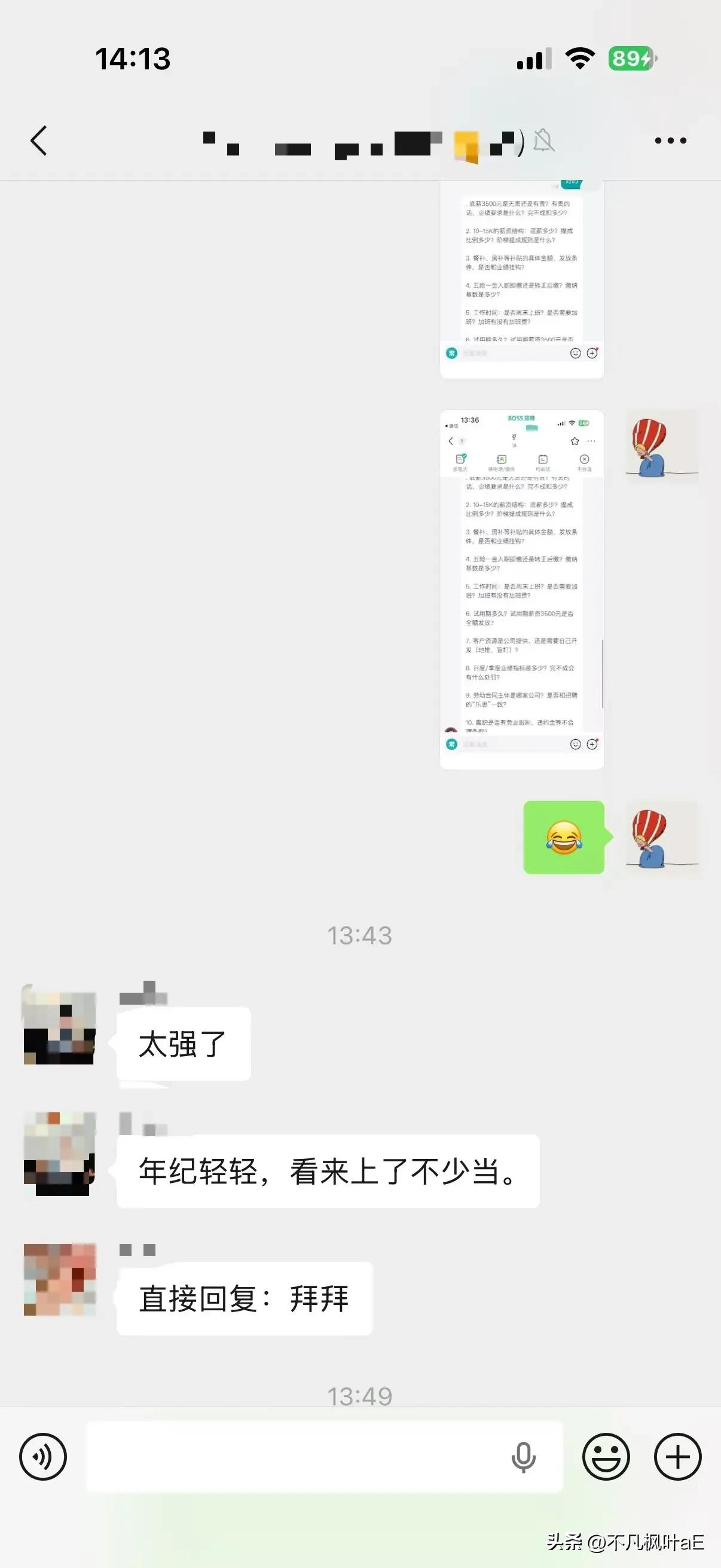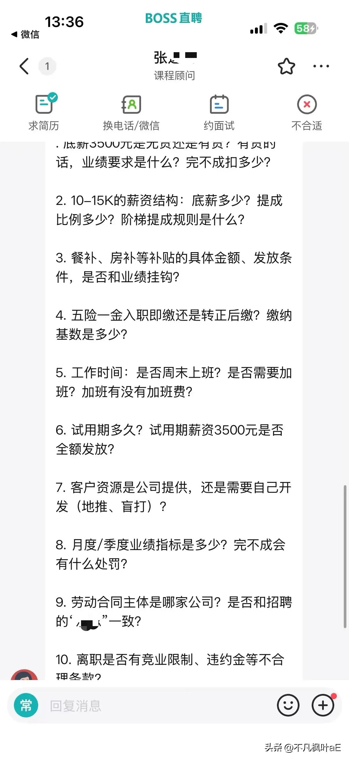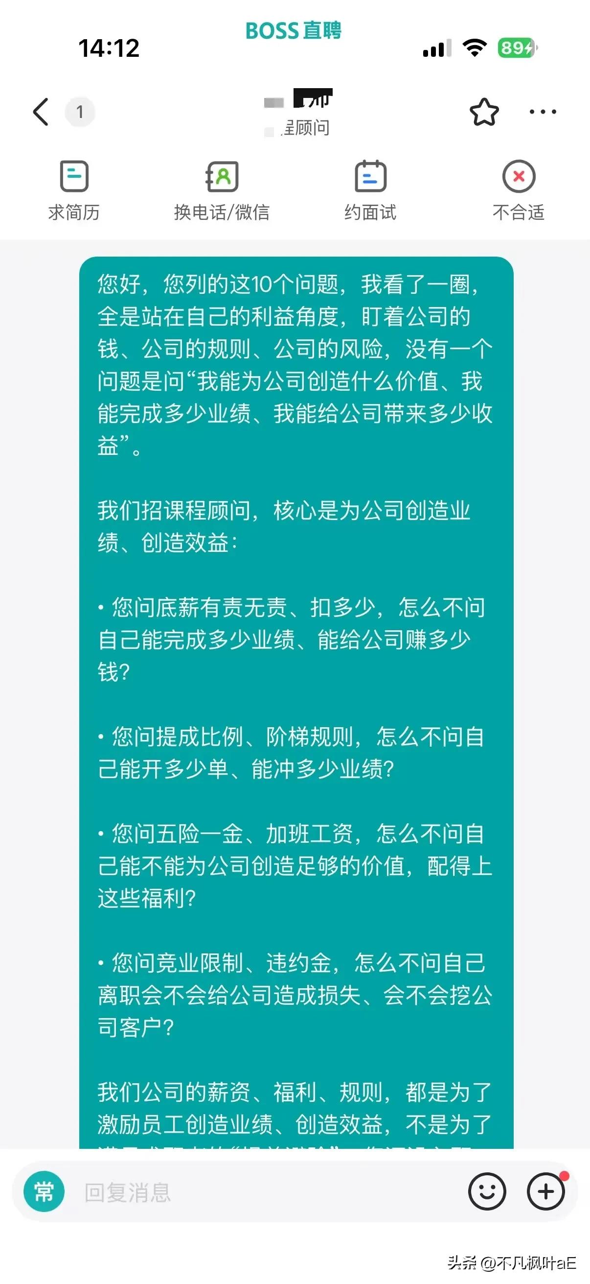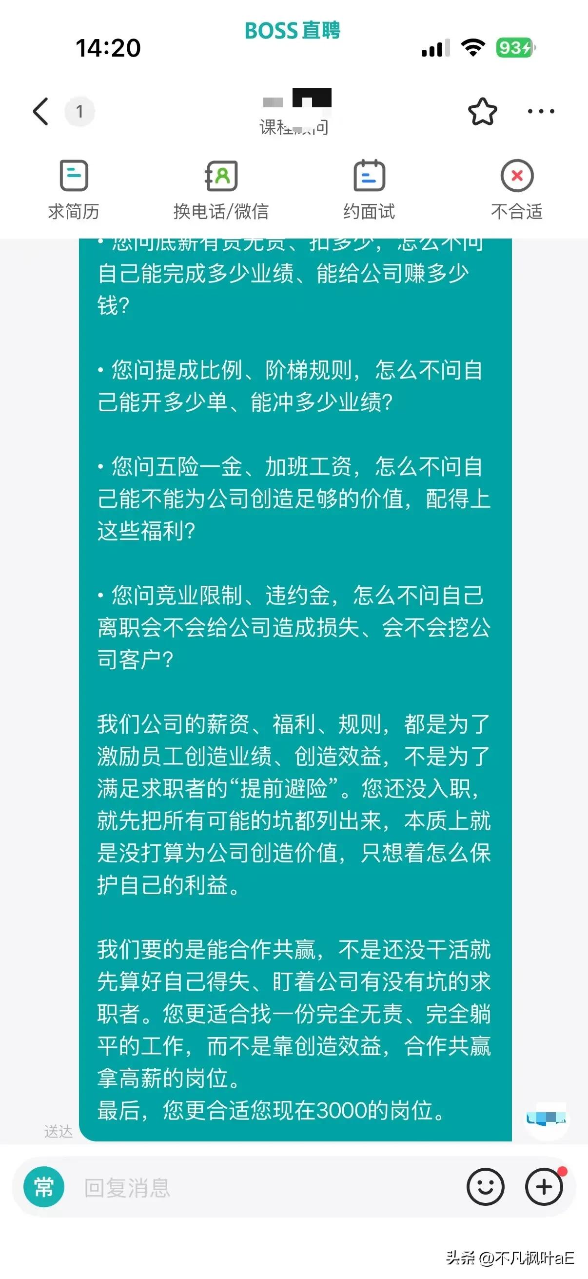 难怪这样的公司招不到人。又要马儿跑又不要马儿吃草。 应聘一个岗位不得做好在入职前做充分的风险排查,难道这是不合理、不正常的求职行为吗?反观HR,没有正面回答任何一个问题,反而反过来PUA求职者,指责求职者“只站在自己利益角度、没想着为公司创造价值”,最后甚至人身攻击,说求职者“只适合3000的岗位”。 这种公司连最基本的求职知情权都不愿意尊重,只会PUA的公司,入职后只会变本加厉地压榨,比如无偿加班、业绩不达标扣底薪、罚款等。 以后找工作,尤其是销售岗,记住这几个铁律: