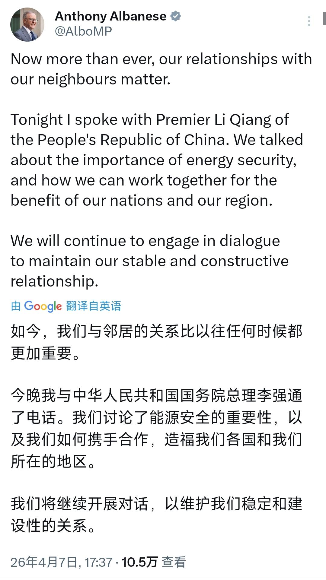澳大利亚总理阿尔巴尼斯今天(4月7日)写道:“如今,我们与邻居的关系比以往任何时