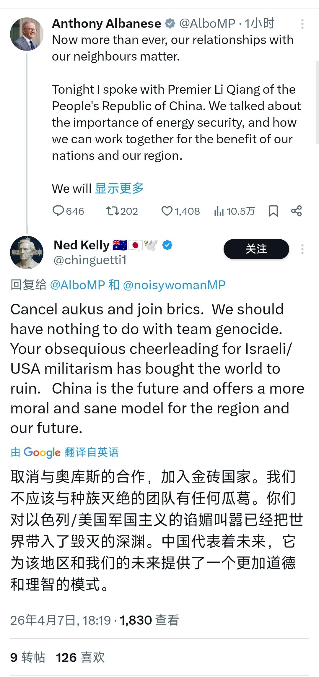 澳大利亚总理阿尔巴尼斯今天(4月7日)写道:“如今,我们与邻居的关系比以往任何时候都更加重要。今晚我与中华人民共和国国务院总理李强通了电话。我们讨论了能源安全的重要性,以及我们如何携手合作,造福我们各国和我们所在的地区。我们将继续开展对话,以维护我们稳定和建设性的关系。” [机智]评几句:在阿尔巴尼斯的评论区,最多点赞的一条留言:“取消与奥库斯的合作,加入金砖国家。我们不应该与种族灭绝的团队有任何瓜葛。你们对以色列/美国军国主义的谄媚叫嚣已经把世界带入了毁灭的深渊。中国代表着未来,它为该地区和我们的未来提供了一个更加道德和理智的模式。”(图三所示)我们不奢望澳大利亚退出奥库斯,但是真心希望能看到一个摒弃阵营对立、回归理性共赢的中澳关系新局。当前双方经贸盘根错节,能源合作更是关乎两国长远民生,这就注定了对抗没有出路,对话才是正道。我们期待阿尔巴尼斯政府能拿出更多政治勇气,将“稳定关系”的共识真正转化为互信行动,别让军事同盟的枷锁绑架了两国人民的福祉。