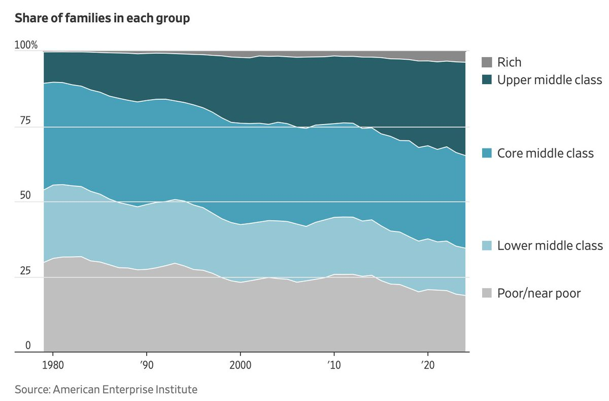 虽然很多人在炒作斩杀线,但是其实统计数字上,美国没有丧失活力,有钱人的比例还是在不断增加。到2024年,约有31%的美国人属于中上阶层,高于1979年的约10%。我相信资本项目贡献很大(房子和股票)。