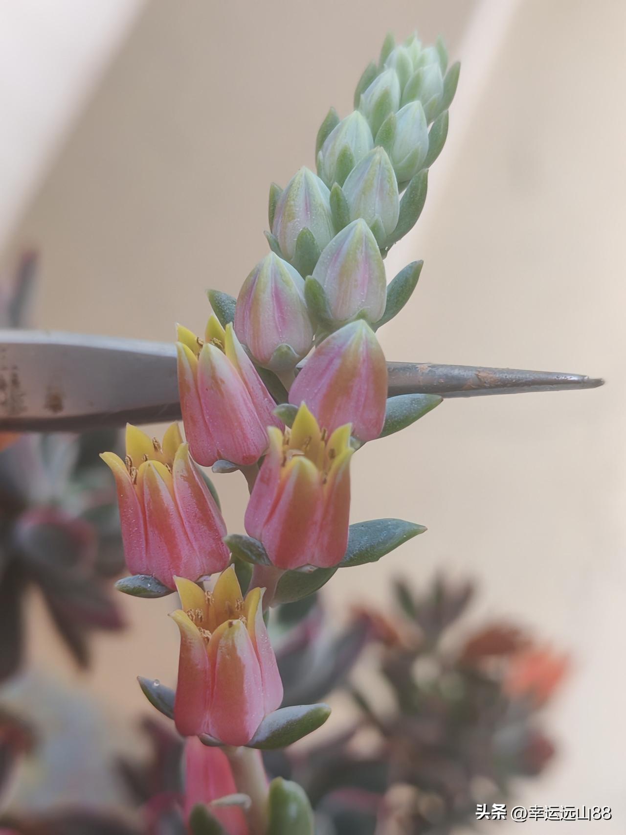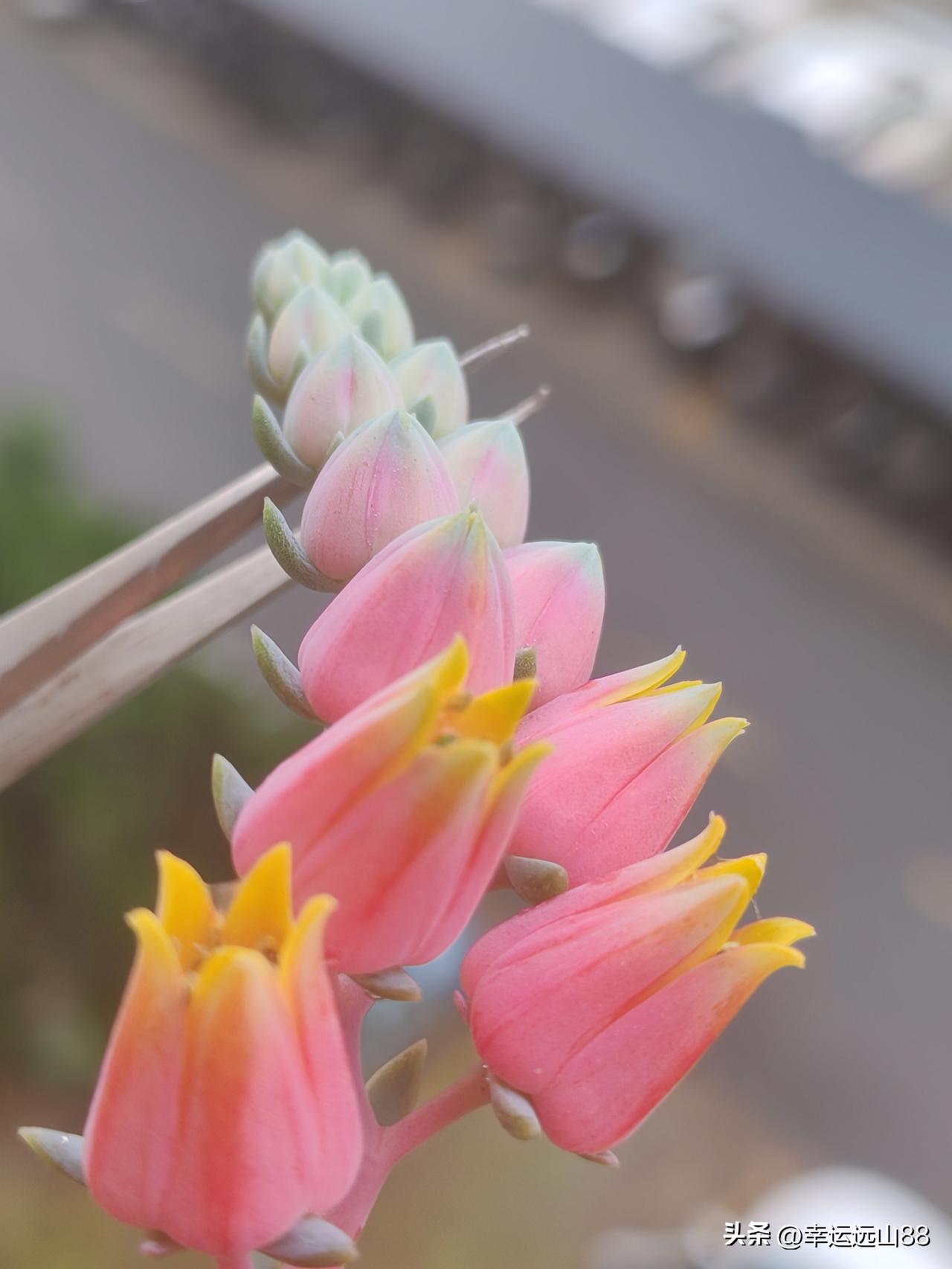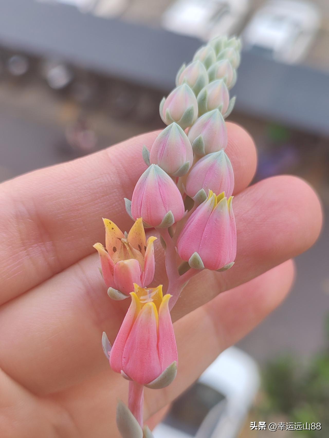 又是收获2026年多肉开花的时候,这几个品种的多肉开花的颜色简直太漂亮了。 这棵大的连续几年都开花了,还没有换过盆,但是每一年都能给我惊喜。 比起来多肉的小黄花品种,这款花苞很大得多,更有观赏性。特别是长长的花剑尾部花苞总是排列整齐,像水滴型💧吊坠一样,随风飘摇,我还深怕花剑承受不了这花穗,一下给折了呢,可以好像我多虑了。 有时特别惊叹植物界的有序规律,作为手残党的我都排布不了这么规整 我特别喜欢这个粉红色且中间带黄颜色,我总是不忍心过早的把花儿剪掉,它的优点也是花期很长,估计一二个月都是很漂亮的。 待最后花差不多了干了,就剪了。可是还是舍不得丢掉呢,于是插到瓶子里插着做成了干花,也不错的。 我之前也直接把剪下来的花枝插到土里,竟然也能生根发芽,挺惊讶的,不放过一点生存的机会。 这样的多肉花,我能不喜欢吗? 绿植多肉植物 多肉成长图鉴 多肉收获 多肉图鉴 园艺多肉 多肉排行 莲花型多肉 晒晒养多肉的幸福 多肉植物