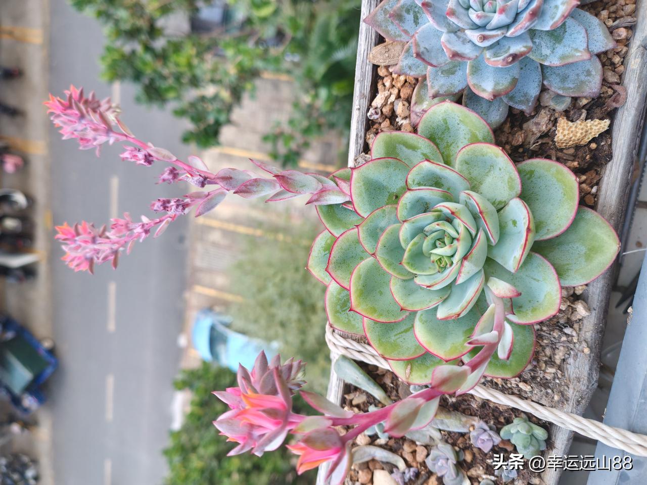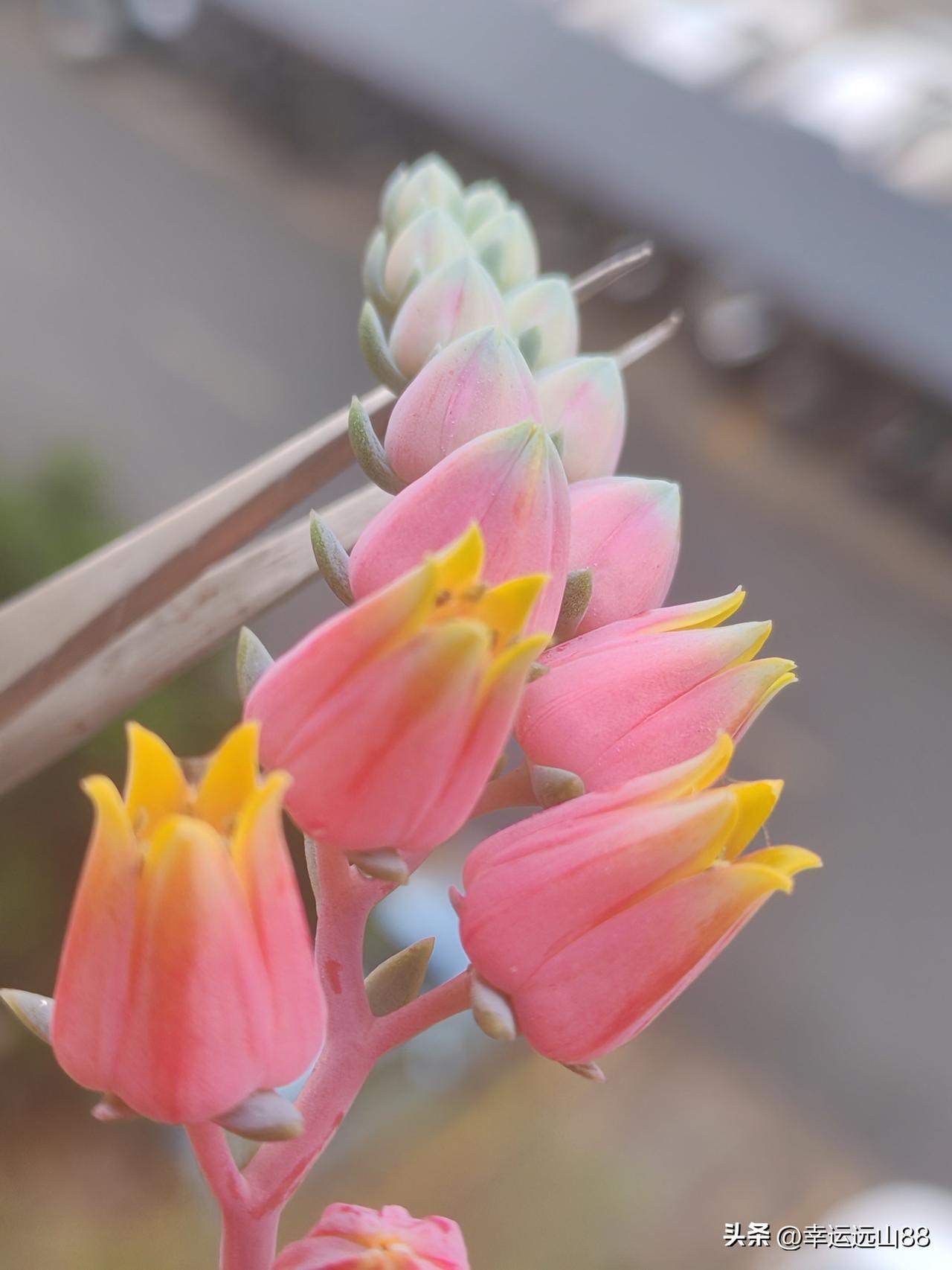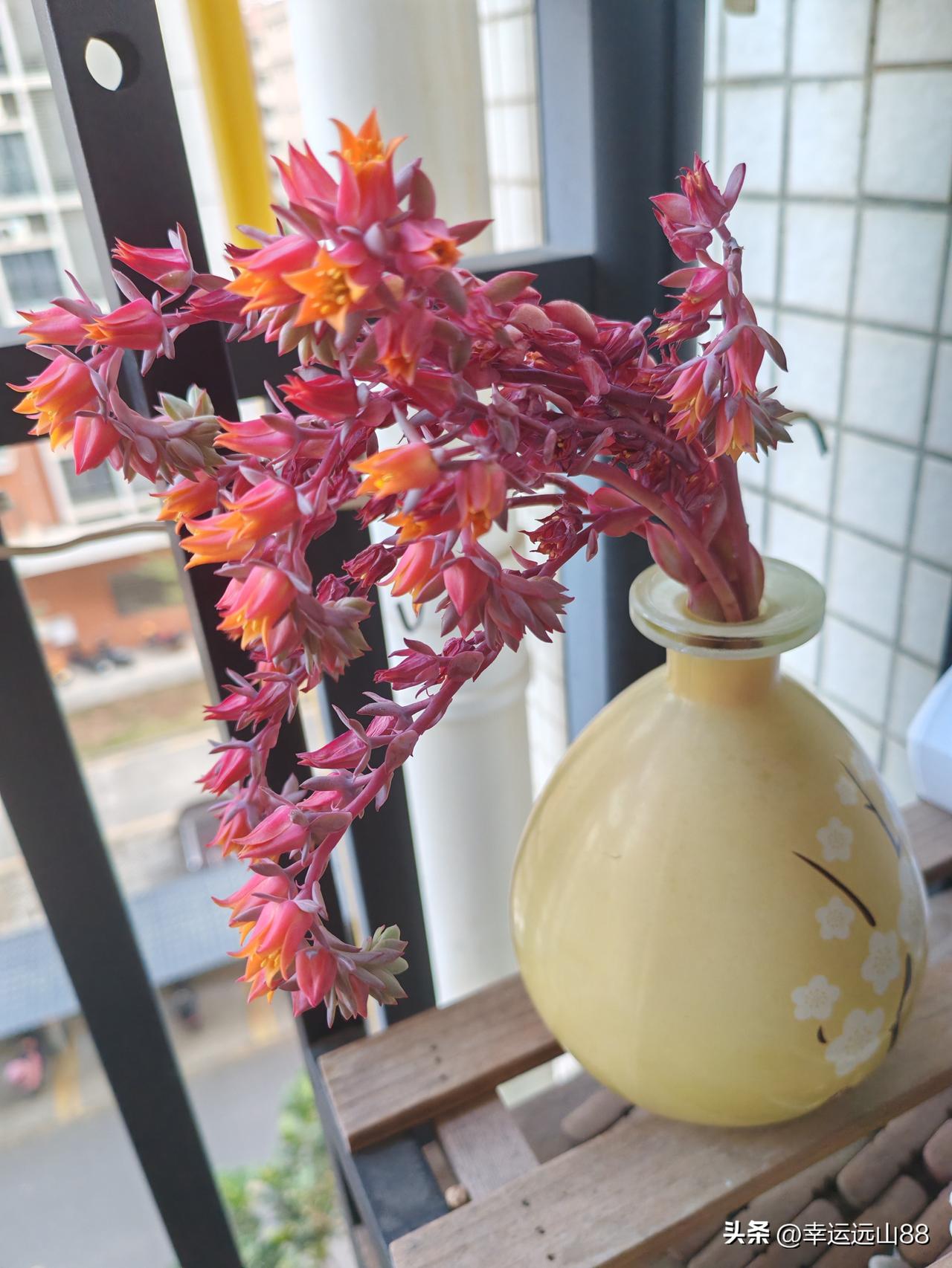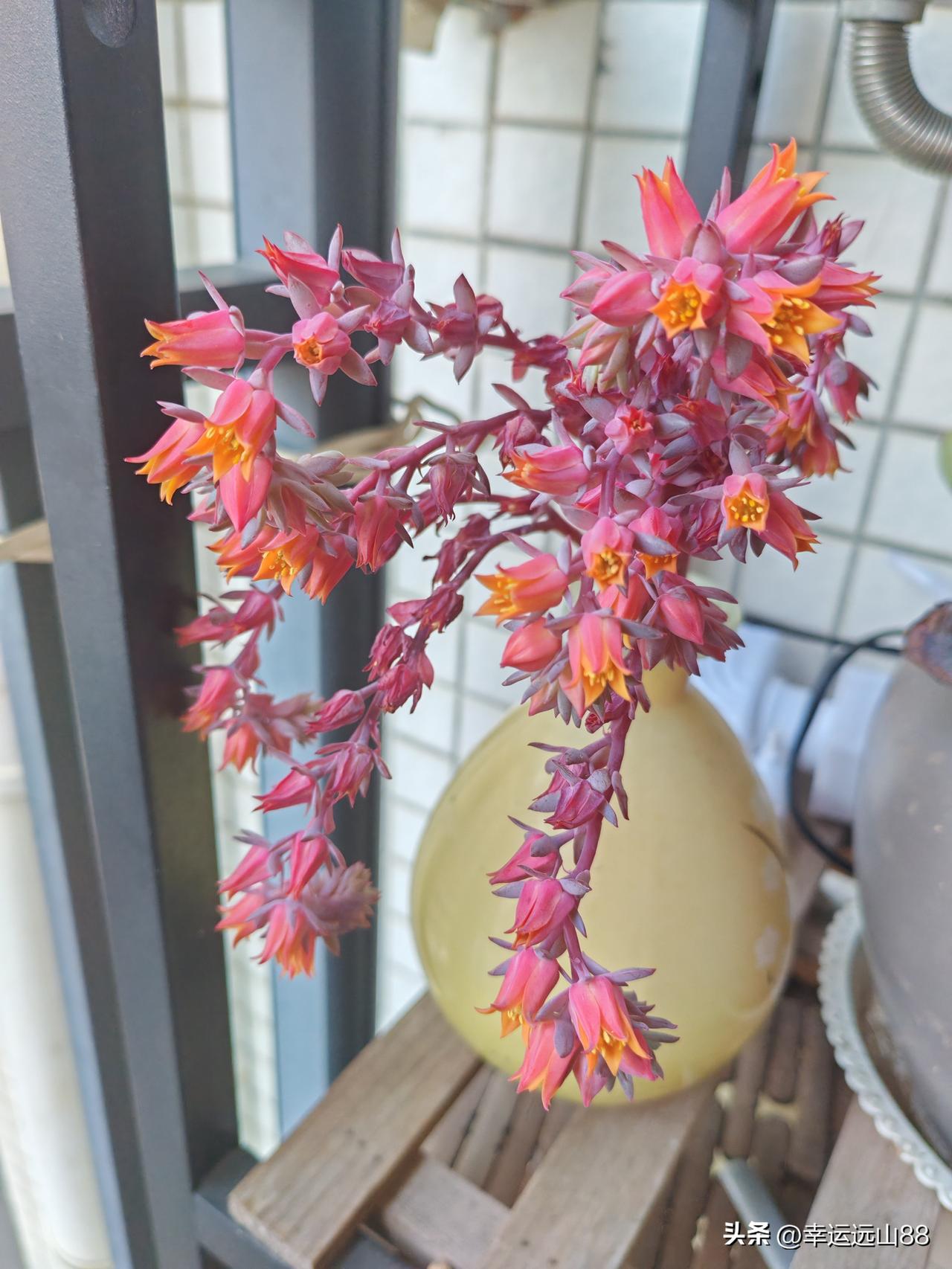 又是收获2026年多肉开花的时候,这几个品种的多肉开花的颜色简直太漂亮了。 这棵大的连续几年都开花了,还没有换过盆,但是每一年都能给我惊喜。 比起来多肉的小黄花品种,这款花苞很大得多,更有观赏性。特别是长长的花剑尾部花苞总是排列整齐,像水滴型💧吊坠一样,随风飘摇,我还深怕花剑承受不了这花穗,一下给折了呢,可以好像我多虑了。 有时特别惊叹植物界的有序规律,作为手残党的我都排布不了这么规整 我特别喜欢这个粉红色且中间带黄颜色,我总是不忍心过早的把花儿剪掉,它的优点也是花期很长,估计一二个月都是很漂亮的。 待最后花差不多了干了,就剪了。可是还是舍不得丢掉呢,于是插到瓶子里插着做成了干花,也不错的。 我之前也直接把剪下来的花枝插到土里,竟然也能生根发芽,挺惊讶的,不放过一点生存的机会。 这样的多肉花,我能不喜欢吗? 绿植多肉植物 多肉成长图鉴 多肉收获 多肉图鉴 园艺多肉 多肉排行 莲花型多肉 晒晒养多肉的幸福 多肉植物