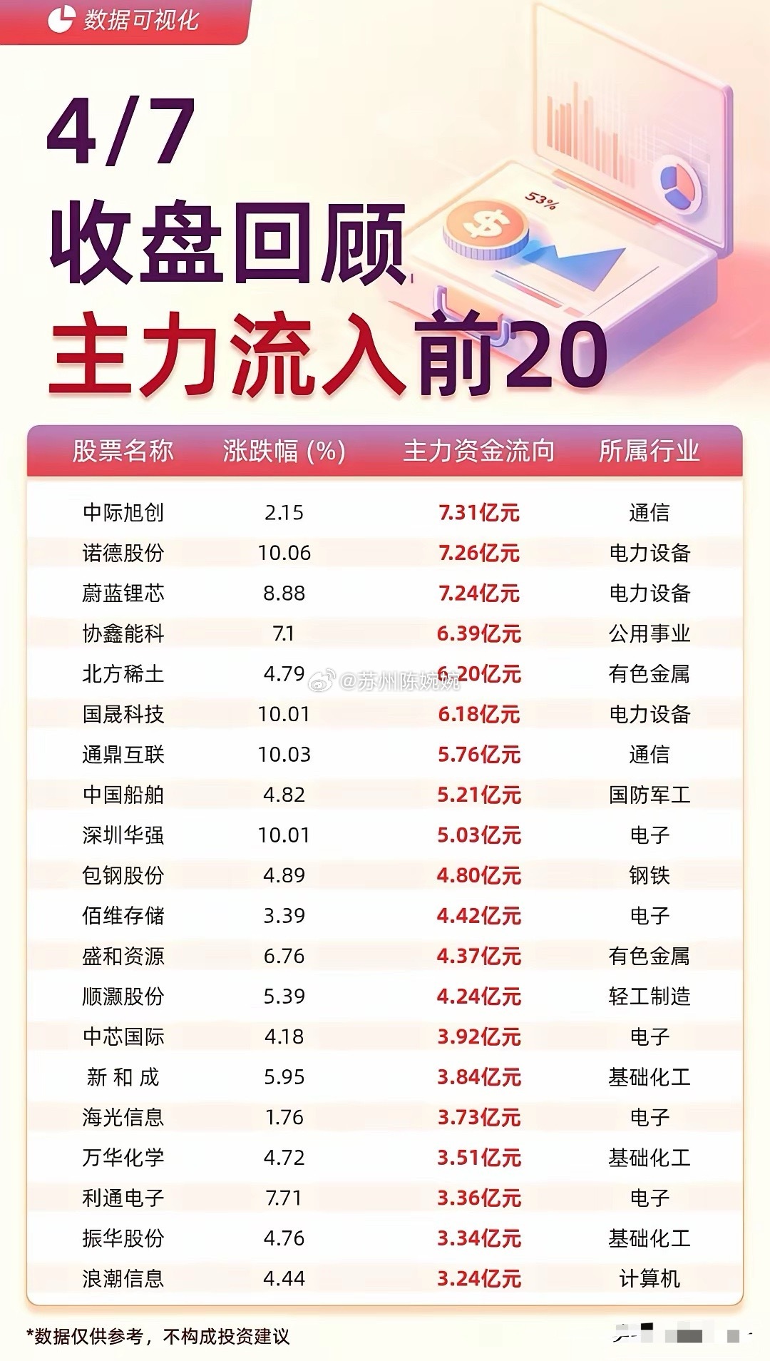 4月7日A股收盘,主力资金动向一目了然!流入榜中,中际旭创以7.31亿元净流入领跑,诺德股份、蔚蓝锂芯等电力设备赛道个股集体获资金追捧,北方稀土、中国船舶等板块龙头也获主力加仓。反观流出榜,金风科技、天孚通信分别以超13亿、11亿的净流出居前,通信、电力设备赛道部分个股遭遇资金抛售,宁德时代、比亚迪等权重标的也出现不同程度资金撤离。资金冷暖分化明显,后续市场风格如何演绎,值得持续关注。数据仅供参考,不构成投资建议