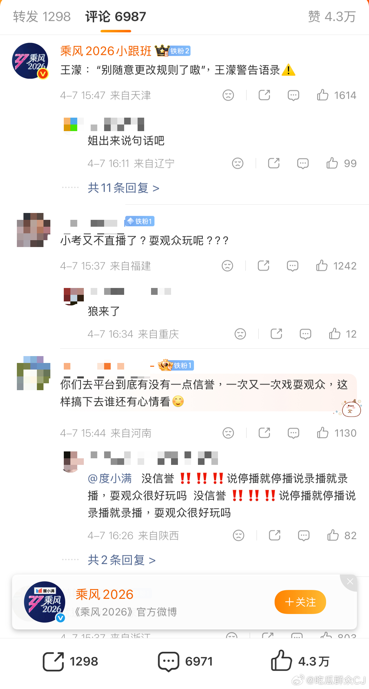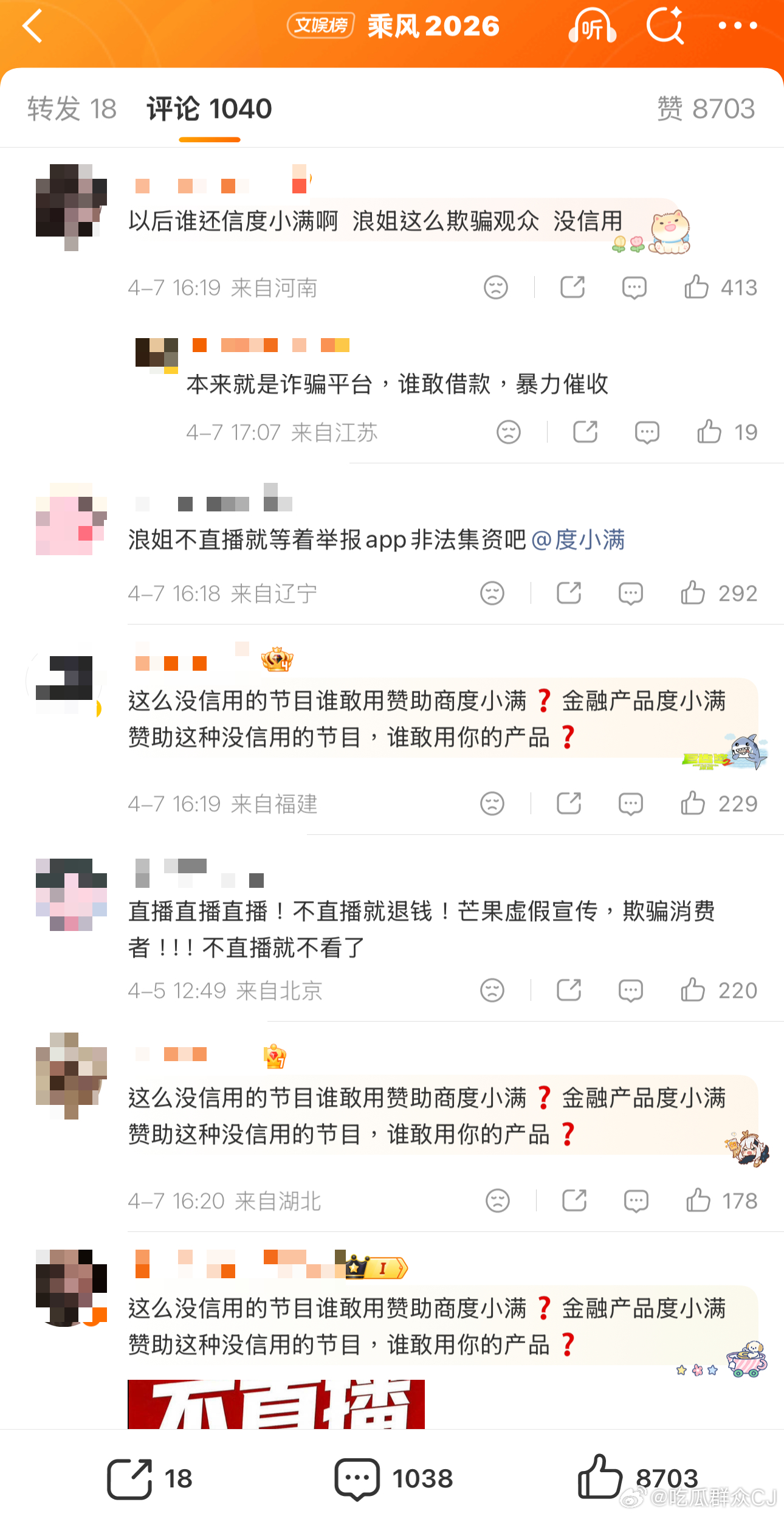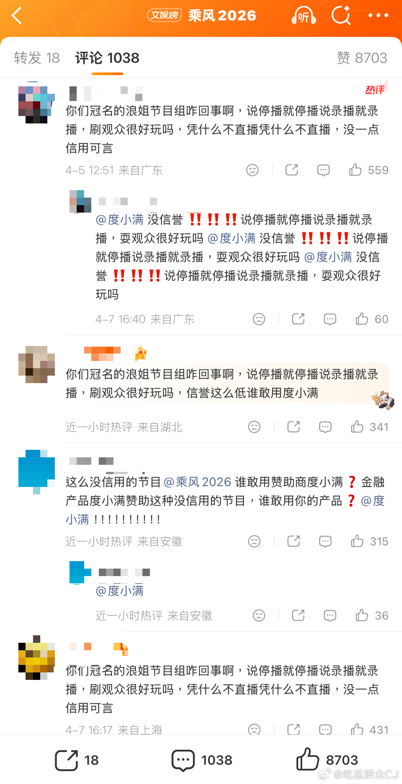 冲着“全程直播”充了会员的观众现在冲了浪姐官博评论区,又去给冠名方度小满施压了,“金融产品赞助没信用的节目谁还敢用?”粉丝们冲品牌出面干预让节目改回直播形式。