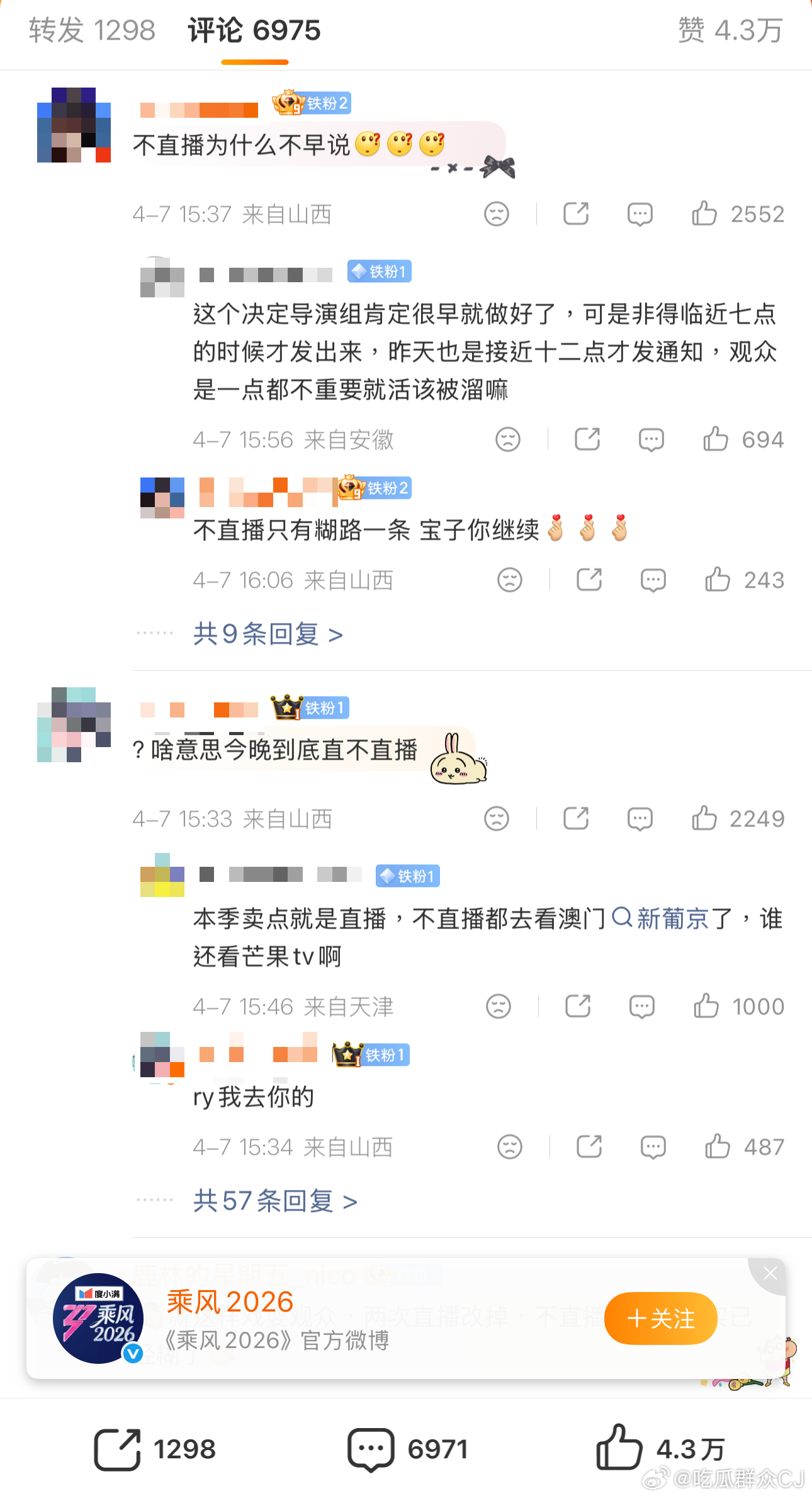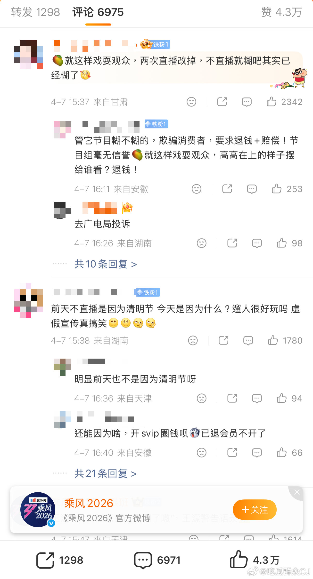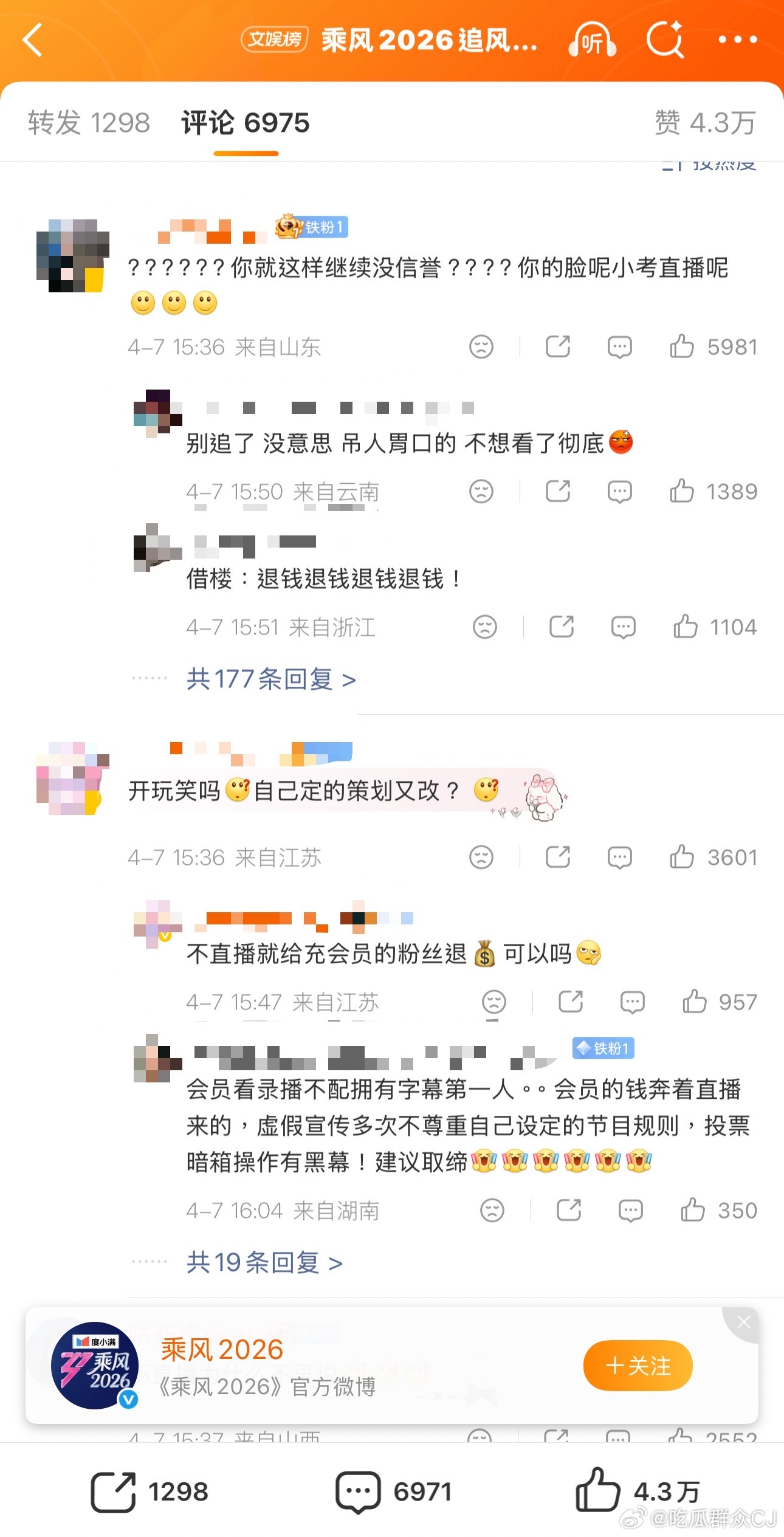 冲着“全程直播”充了会员的观众现在冲了浪姐官博评论区,又去给冠名方度小满施压了,“金融产品赞助没信用的节目谁还敢用?”粉丝们冲品牌出面干预让节目改回直播形式。
