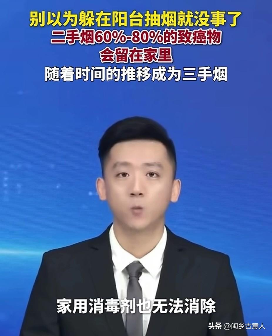别以为在家去阳台抽烟,就不会影响家人了!那会变成三手烟,一样会影响家人的健康,哪怕用家用消毒剂也无法清除。 以上内容是央视旗下的媒体,向公众所科普的知识,就是想告诉那些觉得在家吸烟的人,哪怕你们躲在阳台,躲在卫生间,不在家人面前吸烟也会影响到家人。 央视所科普的知识,肯定是具有权威性,看来现今社会,吸烟的人群如同过街老鼠一样! 公众场所吸烟,禁止! 因为会让路人吸到二手烟! 在家躲阳台、卫生间偷偷抽,也不行! 家人会吸到三手烟。 有了三手烟,也会有四手烟,就问你戒烟不?