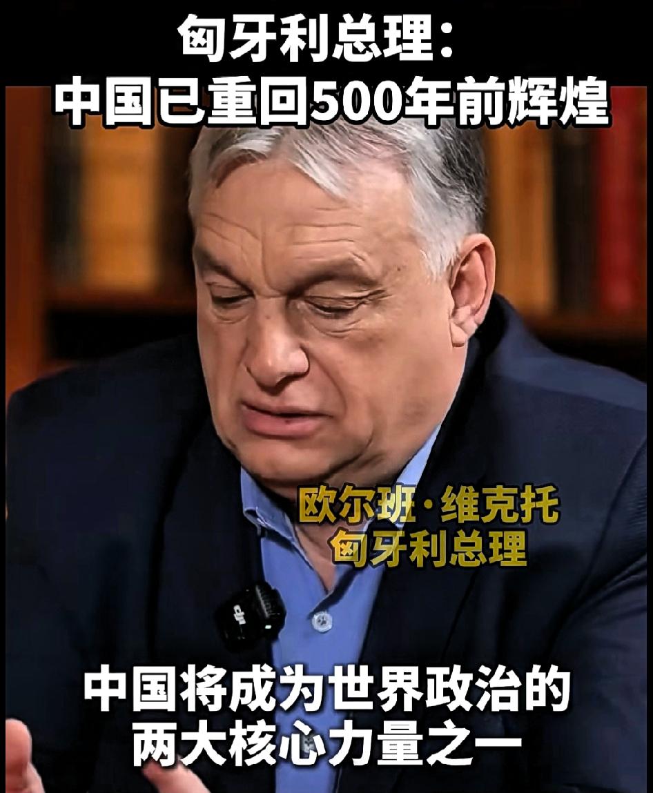 匈牙利总理欧尔班:中国已重回500年前的辉煌! 我认为,“有人能打败中国”的想法是错误的。中国将成为世界政治的两大核心之一。欧洲已经不在行列里了。所以中国会发声,中国会展现自己的实力,中国会影响世界。 对于我们西方人来说,问题在于“我们该如何应对这种局面”?如果我们幻想着能摧毁或击败中国,那就是对局势的误判。因为中国的精神力量和文化底蕴非常强大,他们回来了。就像是他们500年前鼎盛的那样。 因为在西方主导的时代之前,中国一直是最古老,最成功的文明。现在他们只是重新崛起而已,我们必须找到在世界上共存的方式。将后我们必须明白,蔚蓝的天空中至少会有两轮太阳。 评一下: 欧尔班的话,像一记响亮的耳光,抽醒了还沉浸在“西方永远赢”美梦里的那帮人。他直截了当地说:中国,已经回到了500年前的巅峰状态。 500年前的中国什么样?明朝的宝船下西洋,万国来朝,GDP占全球一半还多,那是常态。西方过去500年的霸权,才是历史里的“偶然插曲”。现在中国“回来”了,带着五千年攒下的文化底气,堂堂正正坐回牌桌。欧尔班甚至毒舌补刀:欧洲?早出局了,别往自己脸上贴金。 所以别再幻想什么“击败中国”了——根本不可能。中国的精神力量,是刻在骨子里的韧性,不是几艘航母或几轮制裁就能压垮的。欧尔班给西方指了条明路:别犯蠢,接受“至少两轮太阳”的现实。未来的天空,不再只有华盛顿那一轮独照,北京这轮太阳已经升起,而且光芒越来越强。 欧洲该醒了。与其跟在别人后面搞对抗,不如想想怎么跟崛起的中国体面共存。否则,连当“配角”的资格,都会彻底丢掉。
