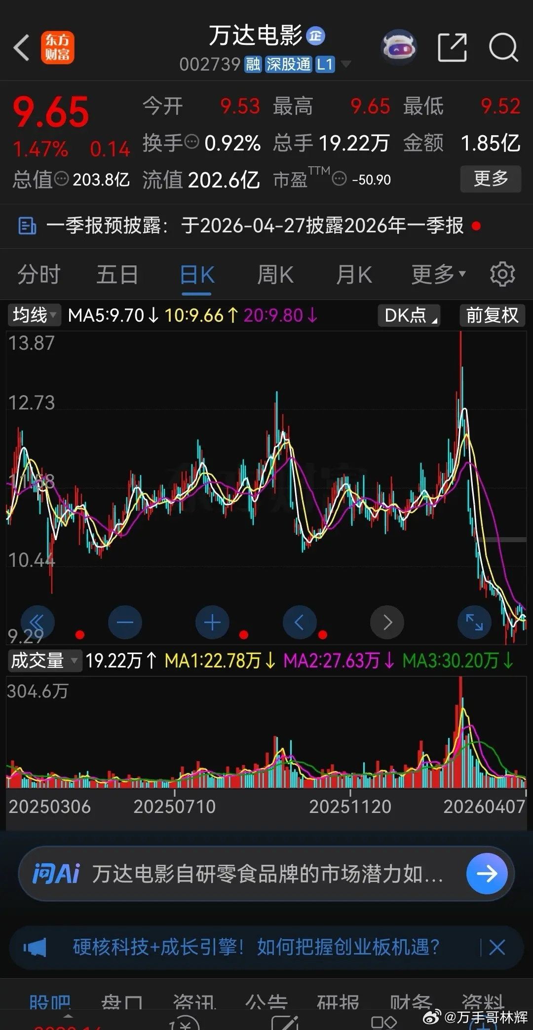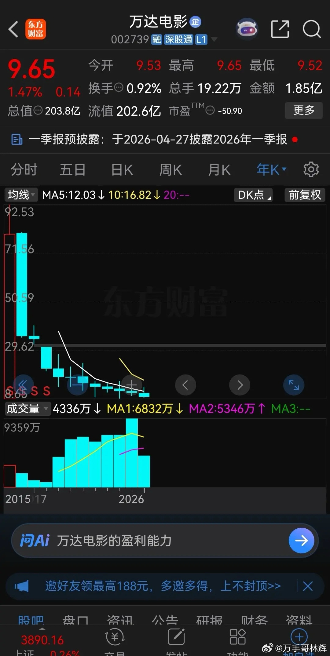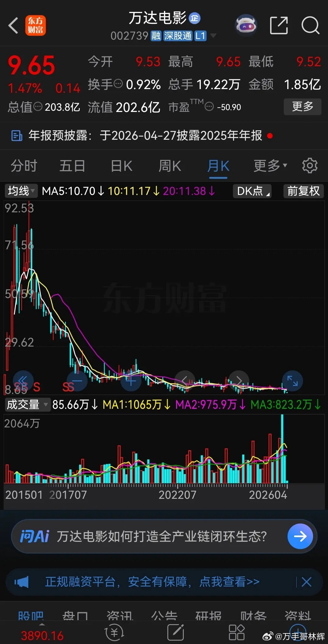 春节前好不容易随着影视院线板块涨了一波,结果仅一个涨停后股价崩盘式下跌,连跌了近两个月,目前股价只有9.65元,这个价格已经快跌到924行情时的最低点了,相当于大盘2800点的位置。可以说无论高位追涨的还是后来一路抄底的,现在基本全被套牢。
