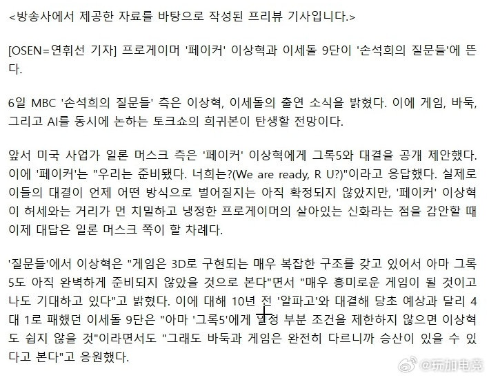MBC《孙石熙的提问》方面宣布李相赫、李世石将出演。届时将诞生一档同时探讨游戏、围棋与 AI 的罕见深度谈话节目。