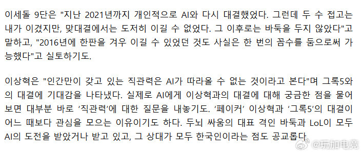 李相赫表示:“我认为人类独有的直觉,是 AI 无法追赶的”,表达了对与 Grok 5 对决的期待。事实上,向 AI 询问与李相赫对战的看点时,AI 大多都会立刻提到 “直觉”。这也是 Faker 李相赫与 Grok 5 的对决备受关注的原因之一。围棋与