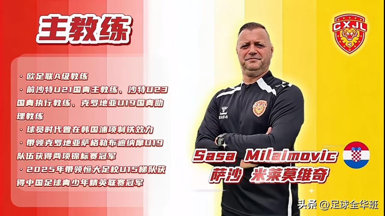 整个教练组一共八人,主教练为萨沙.米莱莫维奇。他最为球迷津津乐道的辉煌成绩,就是率领恒大足校U15梯队获得2025年中青杯联赛冠军!十足的冠军教头!