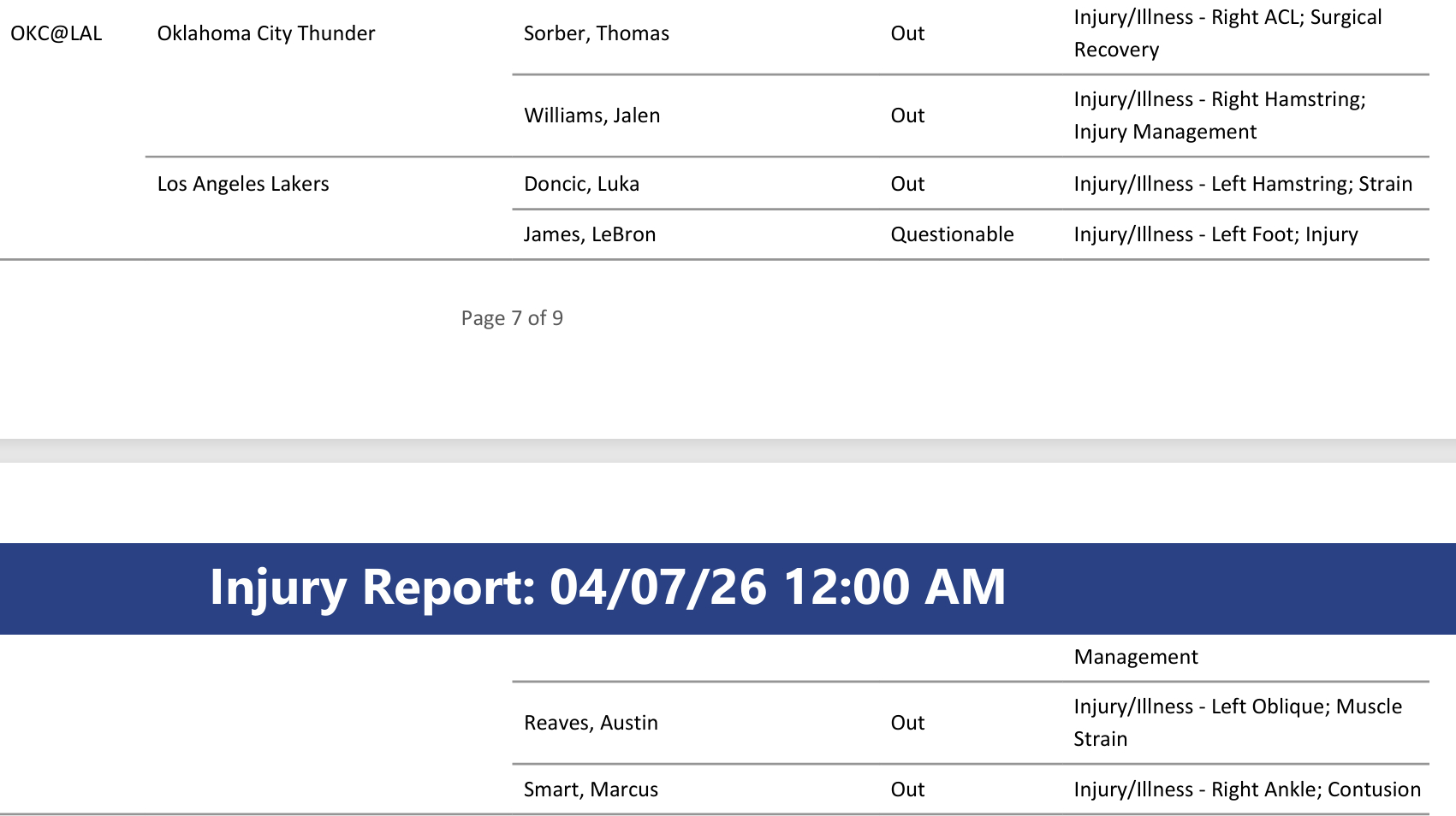 根据伤病报告,杰伦·威廉姆斯因伤病管理而缺席,索伯赛季报销。湖人方面,詹姆斯出战成疑,东契奇、里夫斯和斯玛特缺阵。