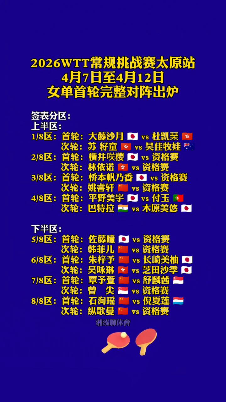 2026WTT常规挑战赛太原站4月7日至4月12日女单首轮完整对阵出炉。