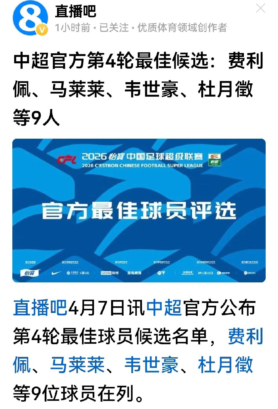中超第4轮太精彩,联赛官方公布MVP候选,竟有9人入列: