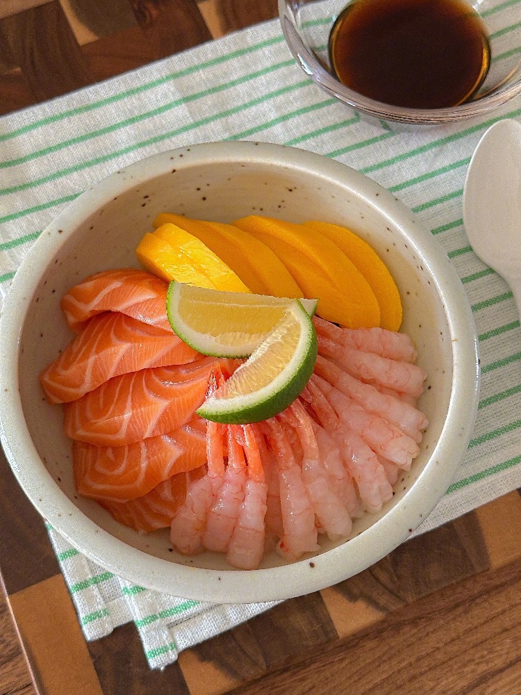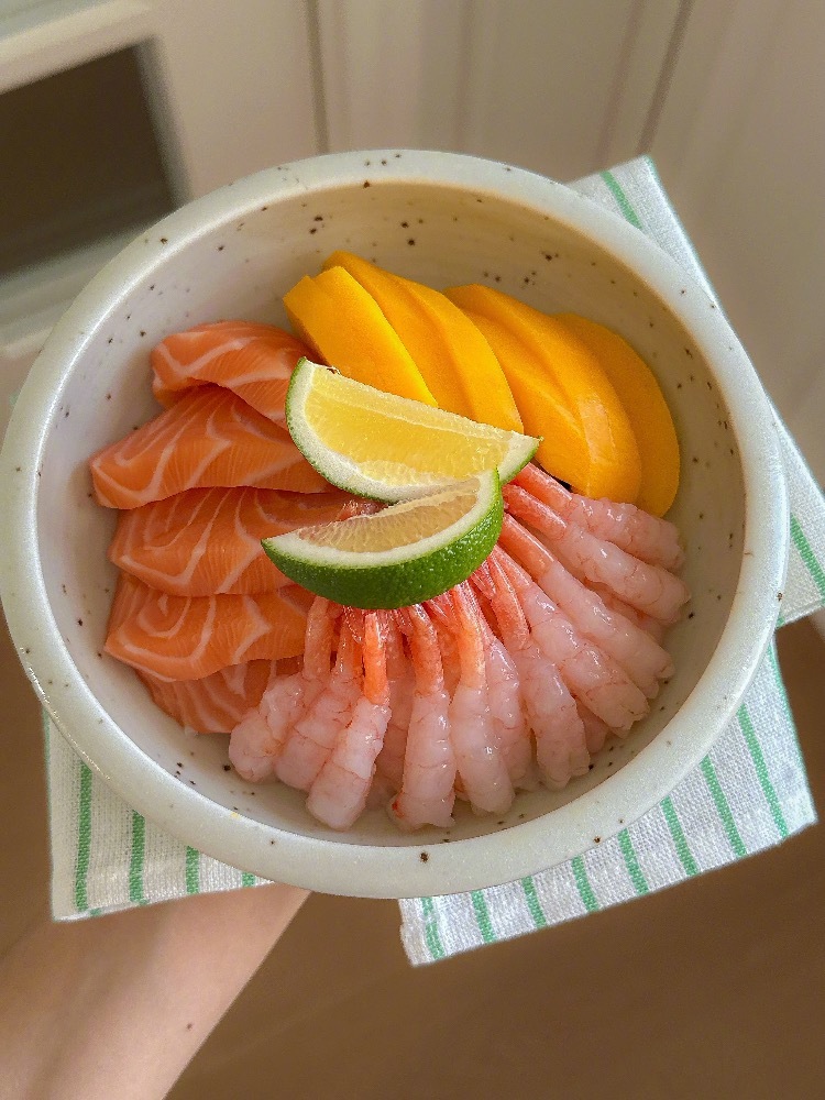 芒果片清新解腻,搭配三文鱼百吃不腻!真的好清爽啊!淋一些青柠汁🍋🟩山葵酱和刺身酱汁就很很很美味了🤤美食分享一碗的幸福