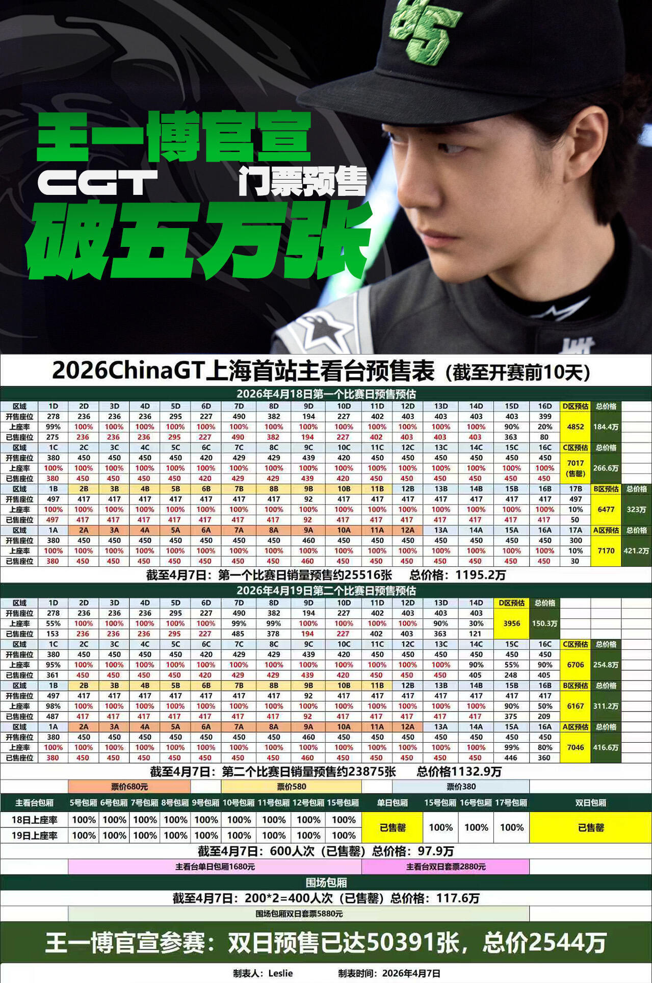 王一博 好强!截止开赛前十天CGT仅看台区域已售5w➕张!销售额2500w➕因为预售火爆又新增了四个区域【主看台18日:新开放四个区域17A/17B/15D/16D】去年的上海八小时耐力赛是4w➕人次,能超越王一博的只有王一博