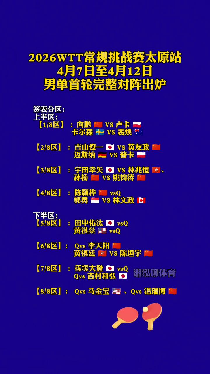 2026WTT常规挑战赛太原站4月7日至4月12日男单首轮完整对阵出炉。