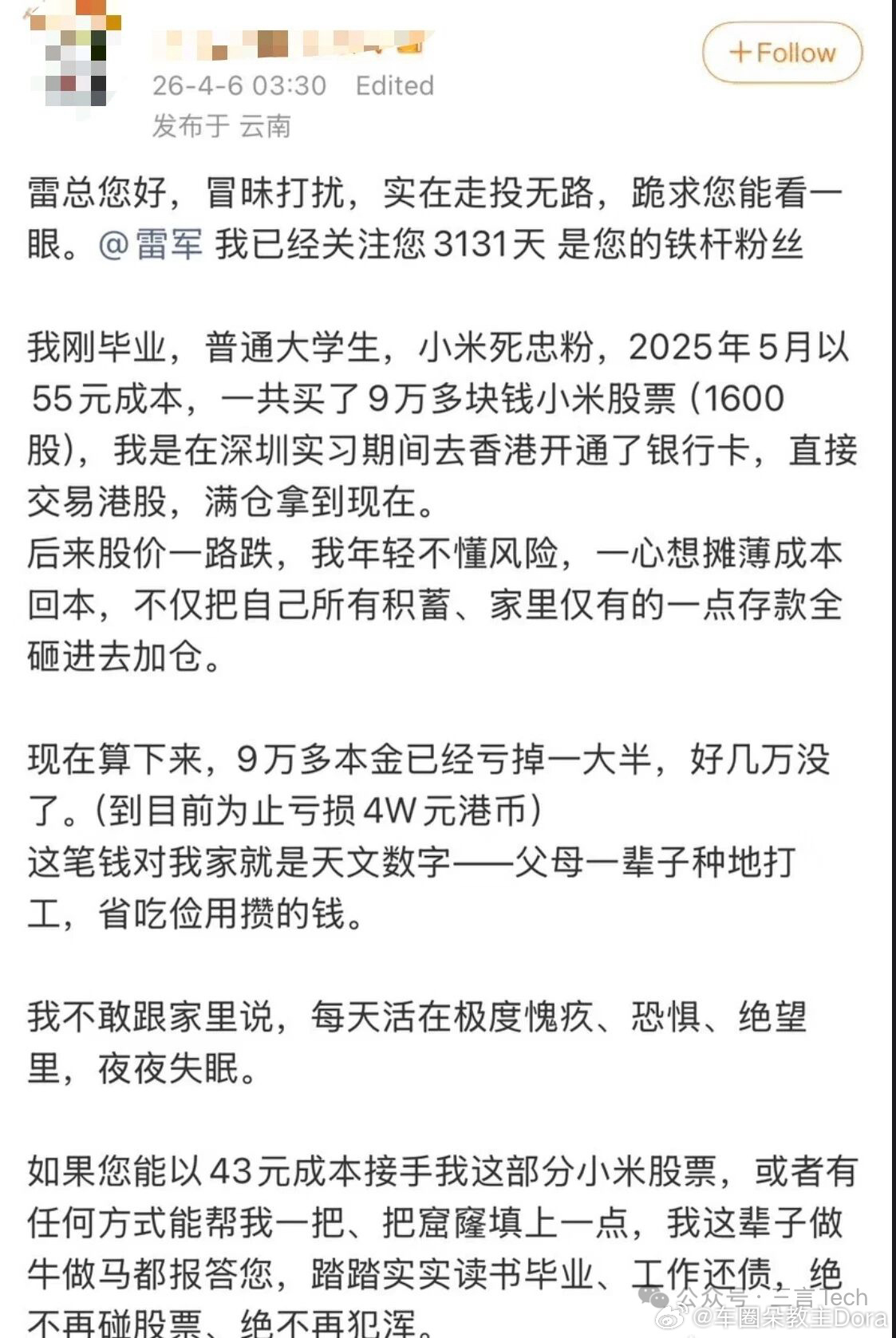 大学生自称搭入家中所有积蓄、全部助学贷款买小米股票赔了好几万,说这笔钱对于家里来说是天文数字,竟喊话雷军“兜底”。巨婴无疑了吧?