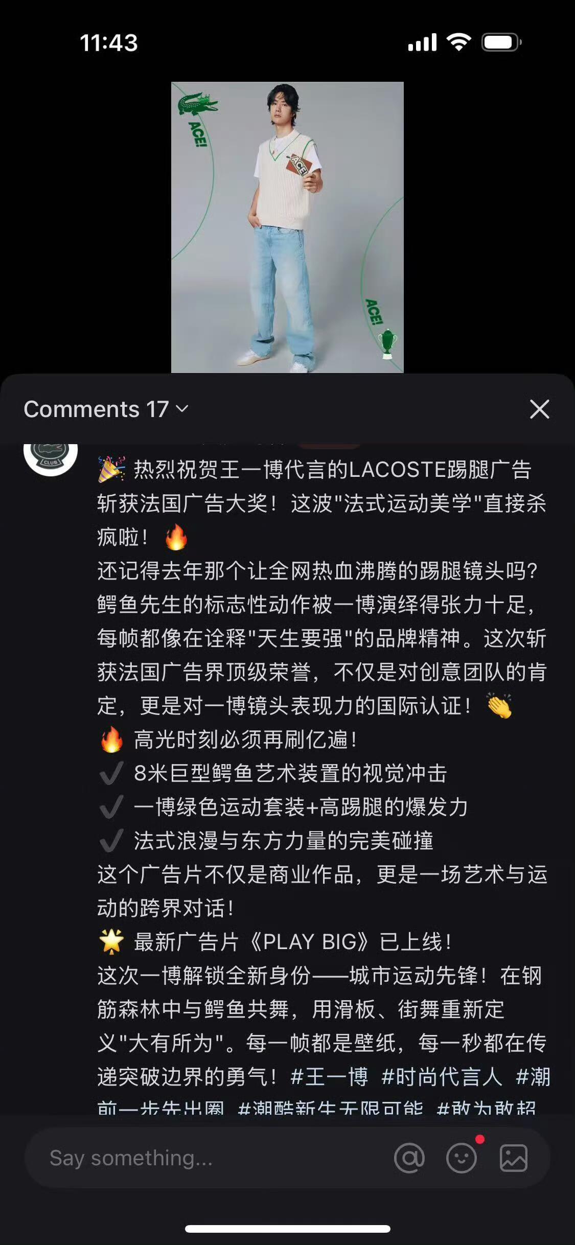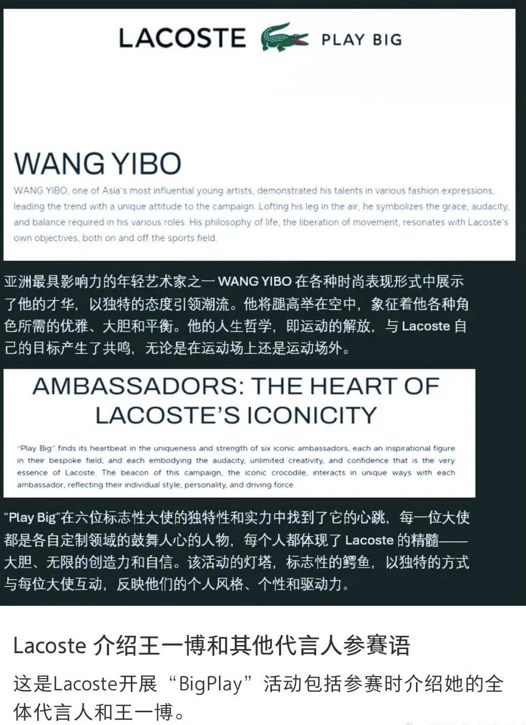 王一博啥都拿奖——去年拍了Lacoste的鳄鱼踢,法国户外传播大奖中Lacoste 凭借全球性广告 《Play Big》斩获的第50届Grand PrixP!鳄鱼踢还上了央视新闻~还被各种模仿和致敬~引领潮流的男人~