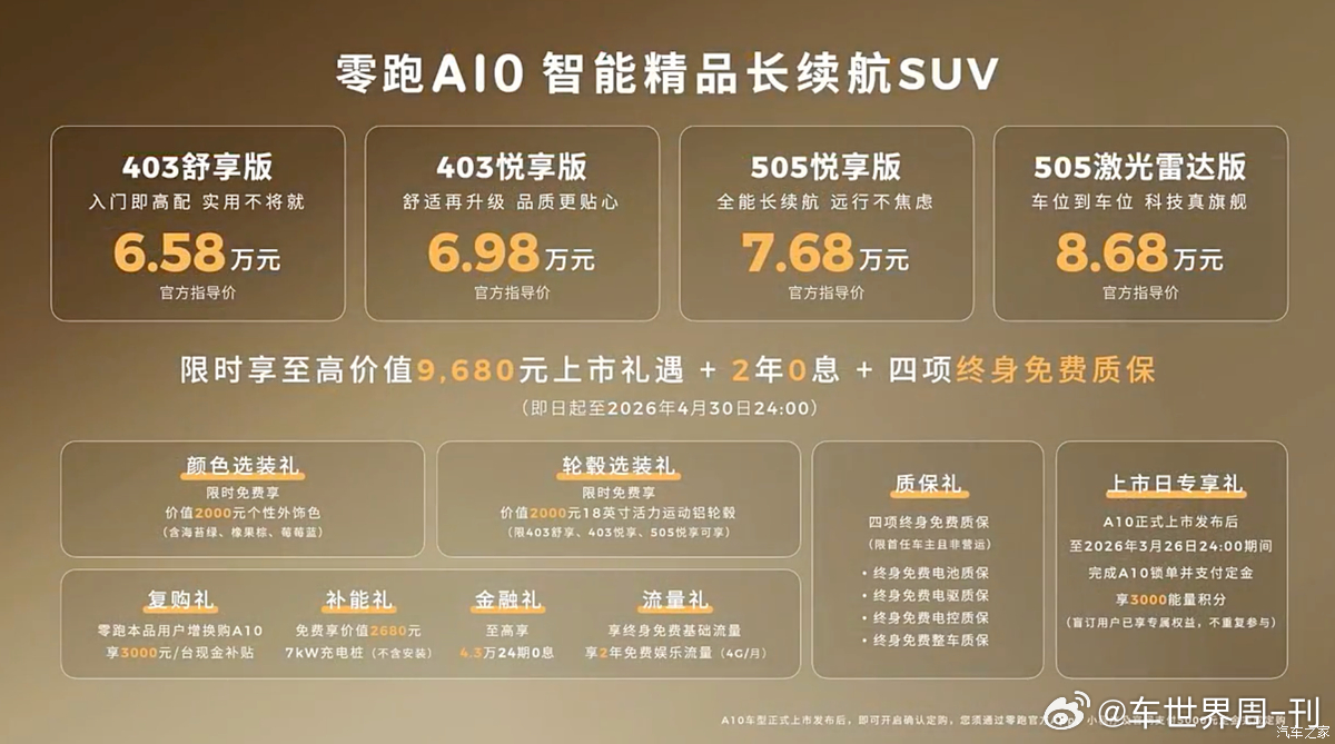 近日,我们从零跑汽车官方获悉,旗下的零跑A10正式上市,新车定位为一台小型纯电SUV,共提供四款配置可选,官方售价区间为6.58万元-8.68万元。它不仅有着时尚讨巧的设计、实用的配置,还在智能化方面有着一定优势,未来市场表现值得期待。不知道您对这款新车是如何看待的呢?不妨来聊聊吧。