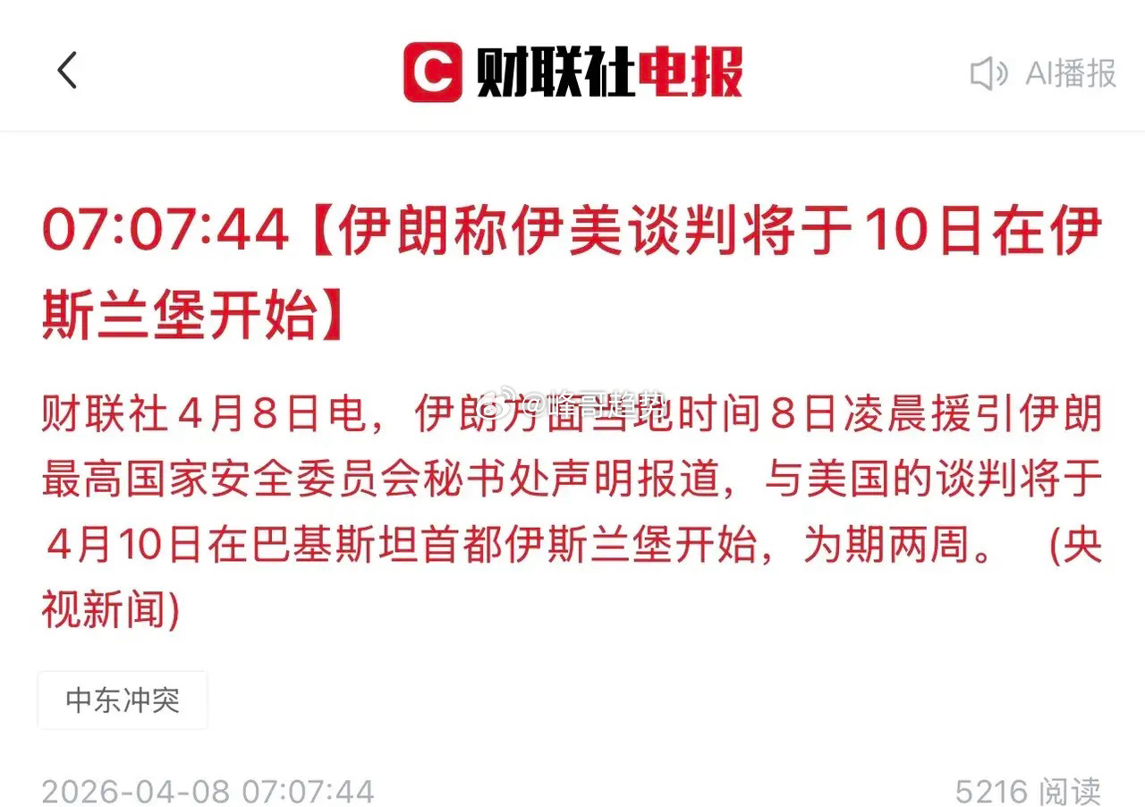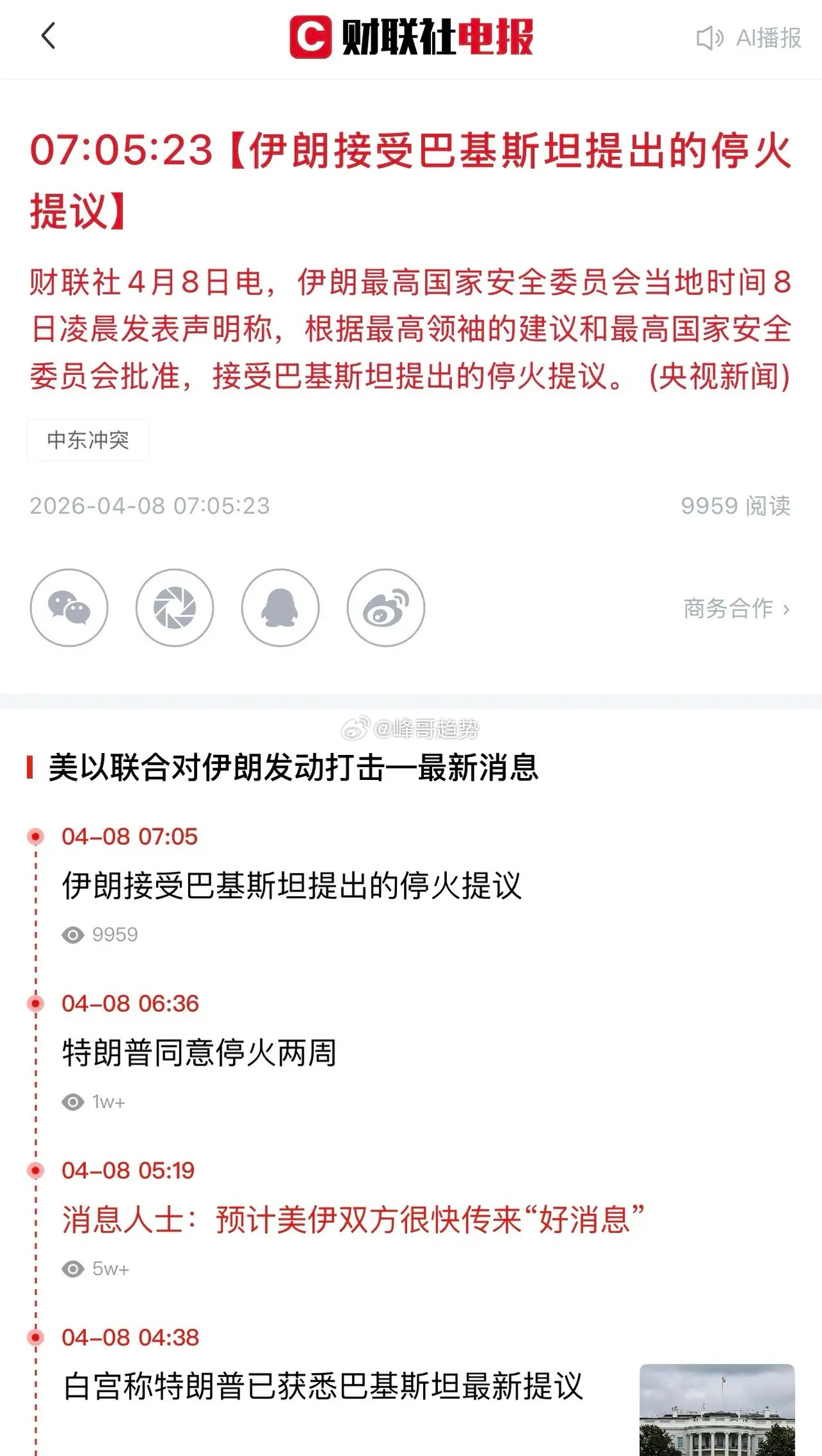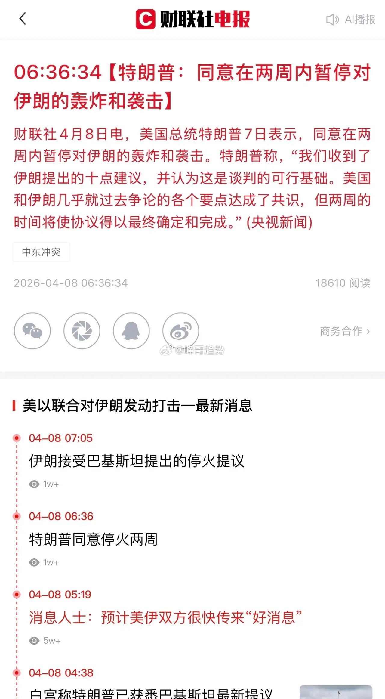 川普同意停火两周,伊方接受巴方提出的停火协议,将要在10号的时候开始进行谈判;