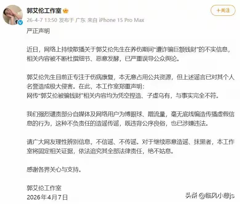 4月7日晚,郭艾伦直播辟谣被骗千万的传闻,听闻此事,内心满是感慨。部分黑粉毫无底线、不择手段地肆意诋毁抹黑他,这般行径着实令人痛心,网络从来都不是法外之地,任何造谣传谣的行为都应受到约束与追责。
