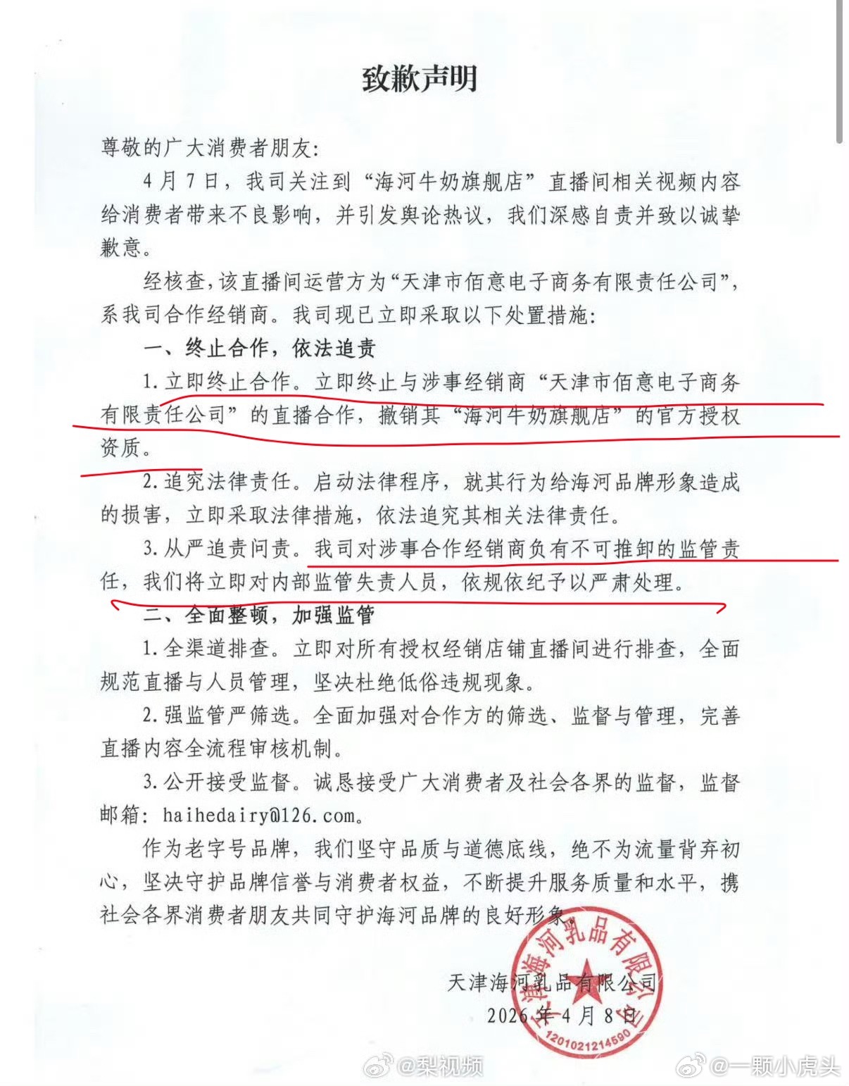 这品牌处理态度不错,是真利落,没有仅开除那个低俗黄毛就完事,是直接终止了那个抖店的官方合作。内部处罚市场监管这一块的工作人员,还追究破坏品牌形象的相关人员!由内而外处理的干干净净了。海河乳品致歉
